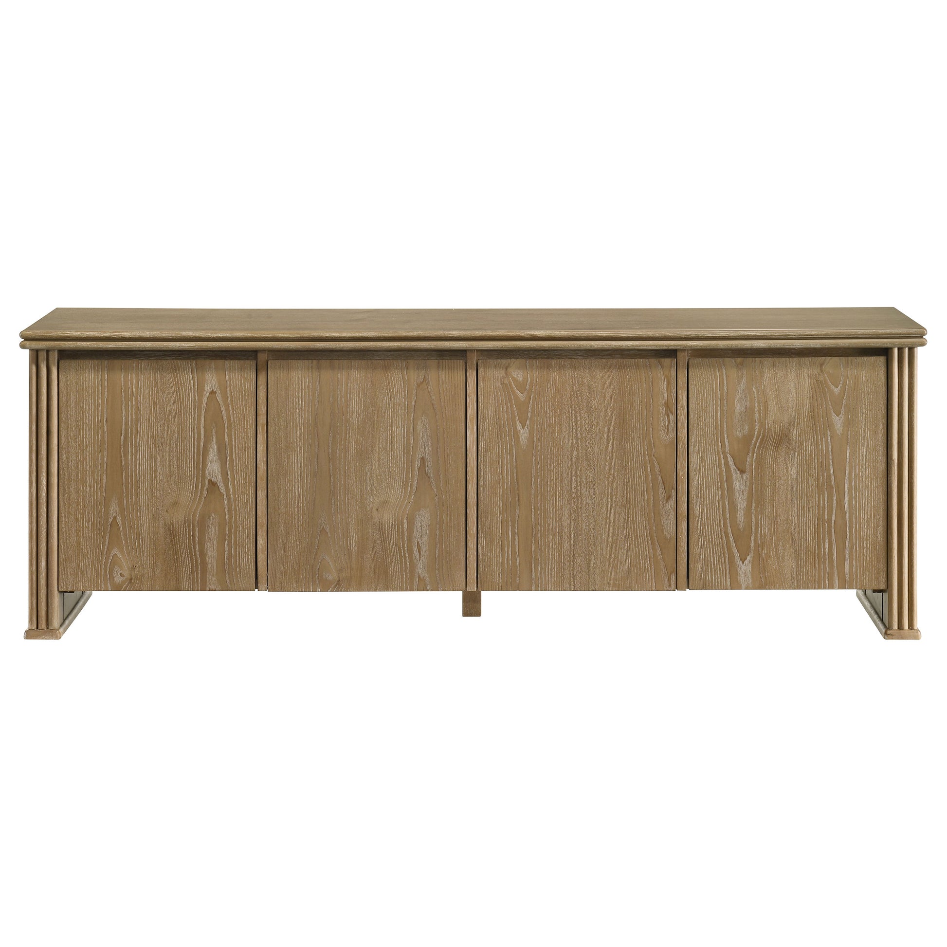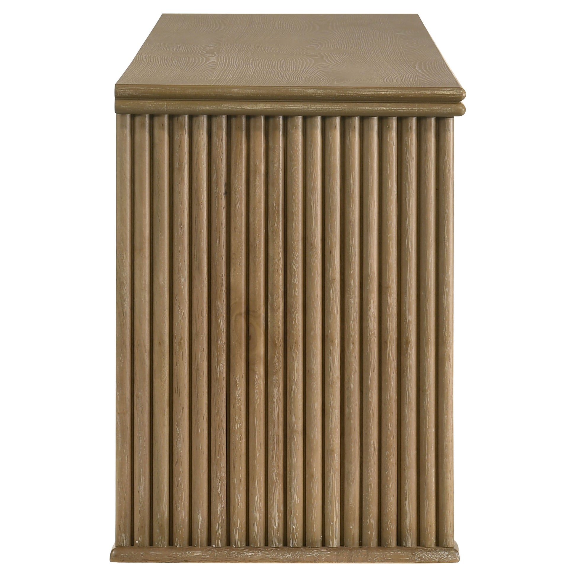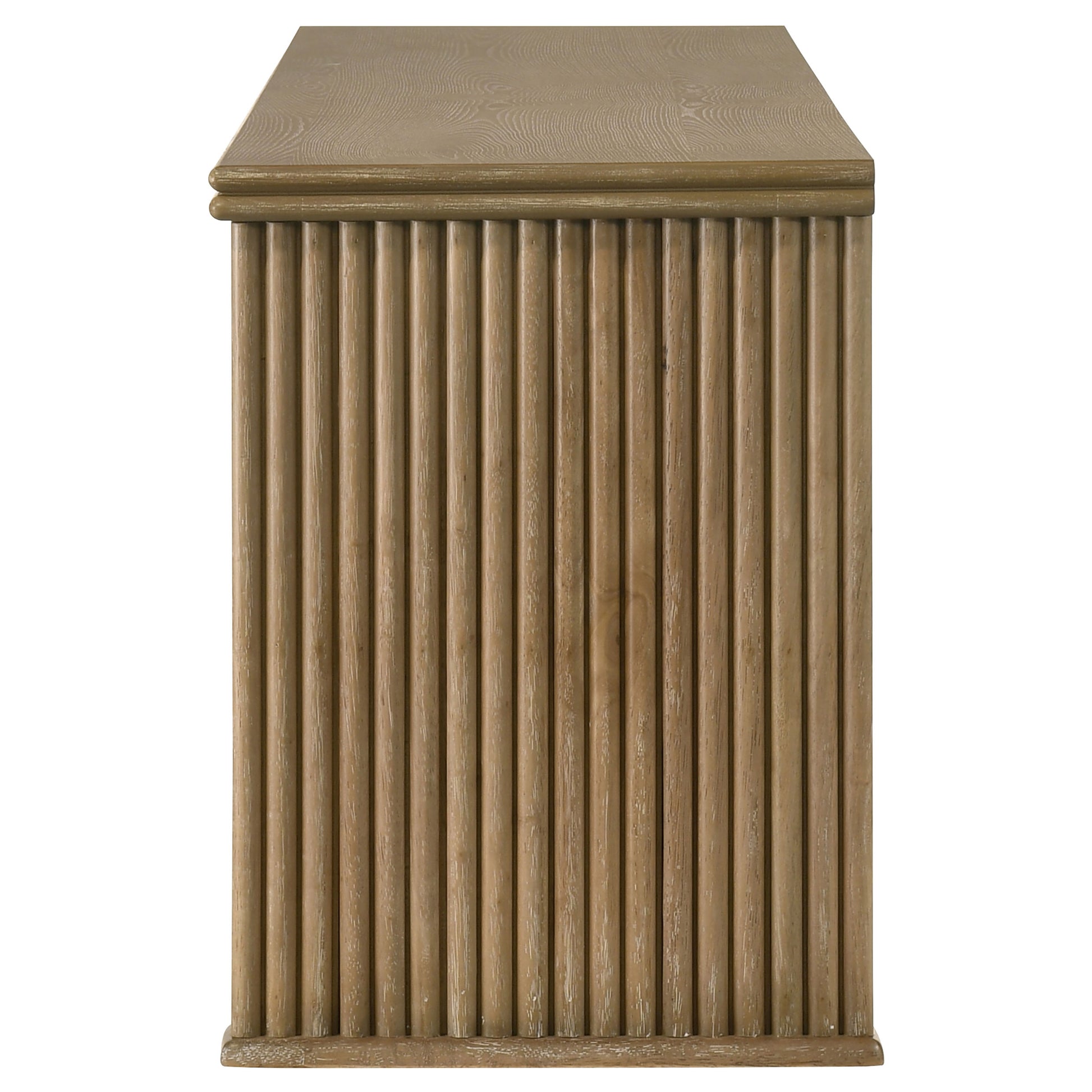 This seventy-inch TV stand combines sculptural texture and functional storage for a grounded living room anchor. Four flat-panel doors conceal generous interior space, complete with fixed shelving and rear cable access cutouts for organized media setup. Vertical reeding along the sides adds visual rhythm to the clean-lined form, while a distressed light brown finish highlights the natural grain. Built from engineered wood and oak veneer, this media console offers both form and utility.