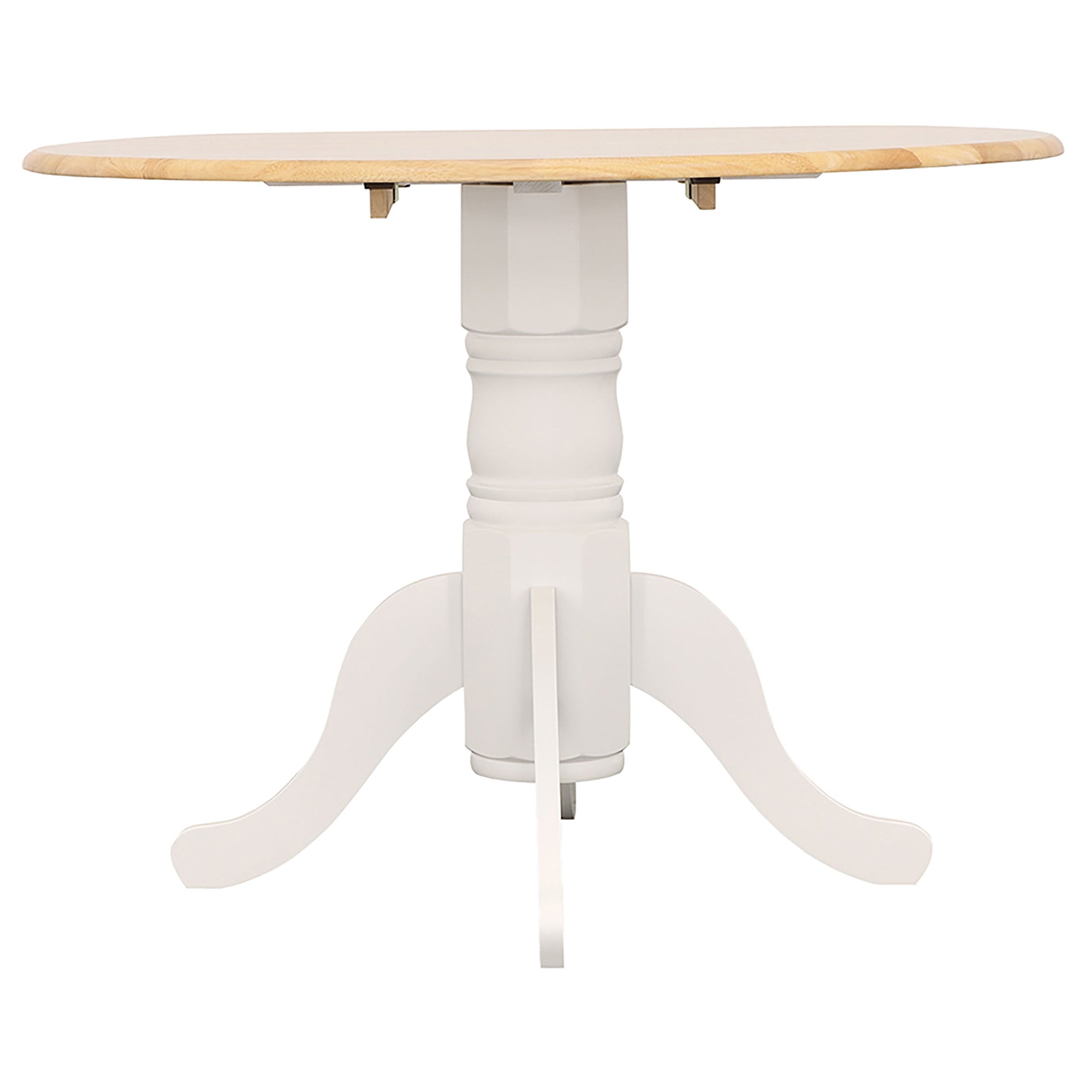 Bring cozy charm to your dining area with this round drop leaf dining table. Designed with a smooth tabletop and sturdy pedestal base, it combines traditional craftsmanship with functional versatility. The drop-leaf design allows you to expand or reduce the surface space as needed, perfect for compact dining areas or breakfast nooks. Elegant curved legs add a touch of sophistication, while the contrasting natural wood top and white base create a bright, welcoming two-tone look for everyday gatherings.
