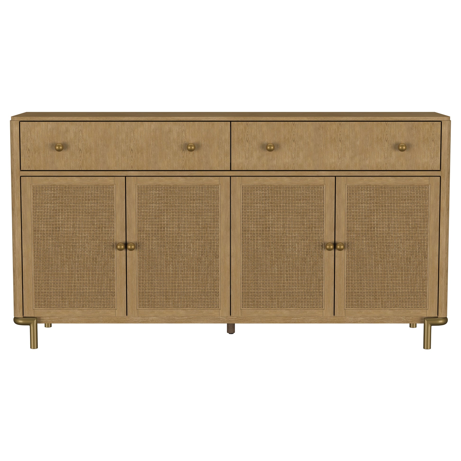 This 65-inch sideboard combines modern sophistication with organic charm and exceptional functionality. Featuring handcrafted woven cane door panels from Indonesia, it adds natural texture to any space. Constructed from solid rubberwood and white ash veneer, its refined craftsmanship is enhanced by a 17-step finishing process. Felt-lined drawers with English dovetail construction glide smoothly on 45mm metal ball-bearing tracks, while soft-close Euro-hinged doors and adjustable shelves offer practical storage. Antique brass knobs and legs complete the elegant design.