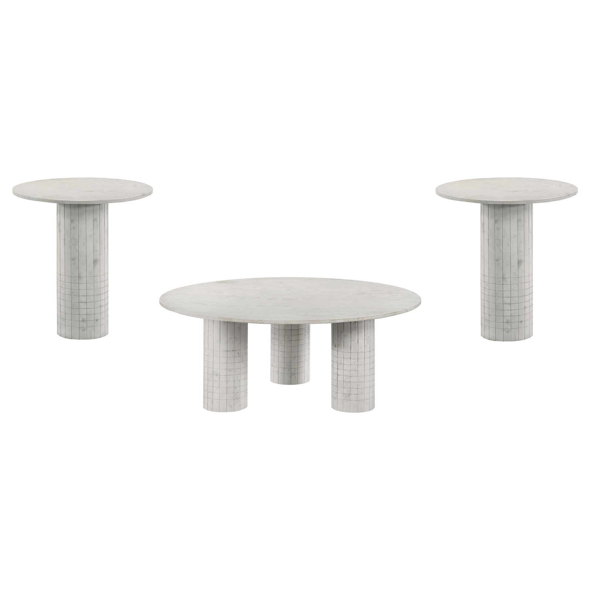 This coffee table set, featuring a coffee table and end table, showcases genuine white marble surfaces and cylindrical pedestal bases. The fluted and grid-textured design adds a refined architectural touch, blending classic elegance with modern minimalism. Perfect for creating a cohesive look in your living space, these tables are crafted for durability and timeless appeal. Ideal as functional and decorative pieces, this occasional table set brings sophistication to any contemporary or upscale interior.