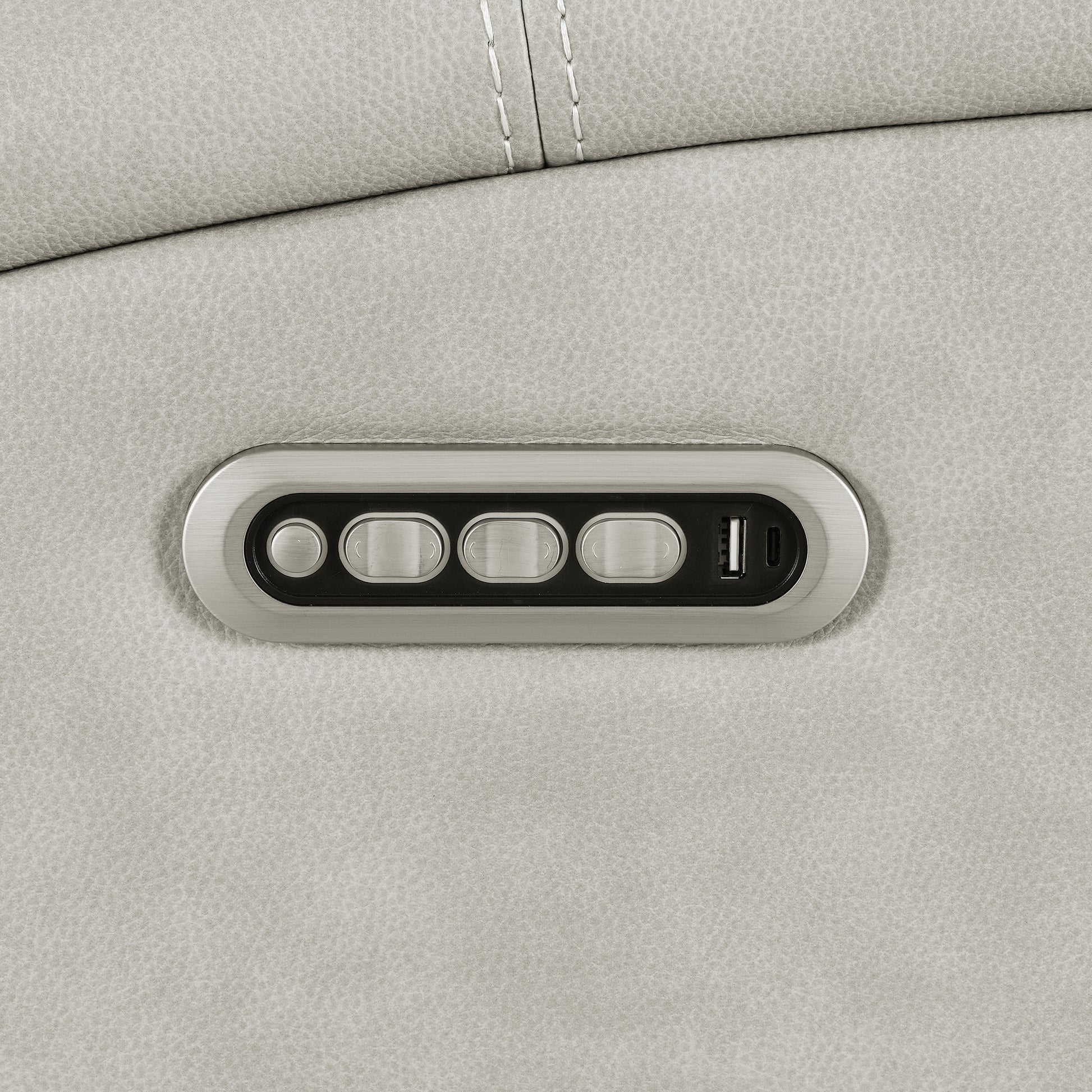 • Grey leatherette upholstery with contrast stitching adds modern texture and comfort