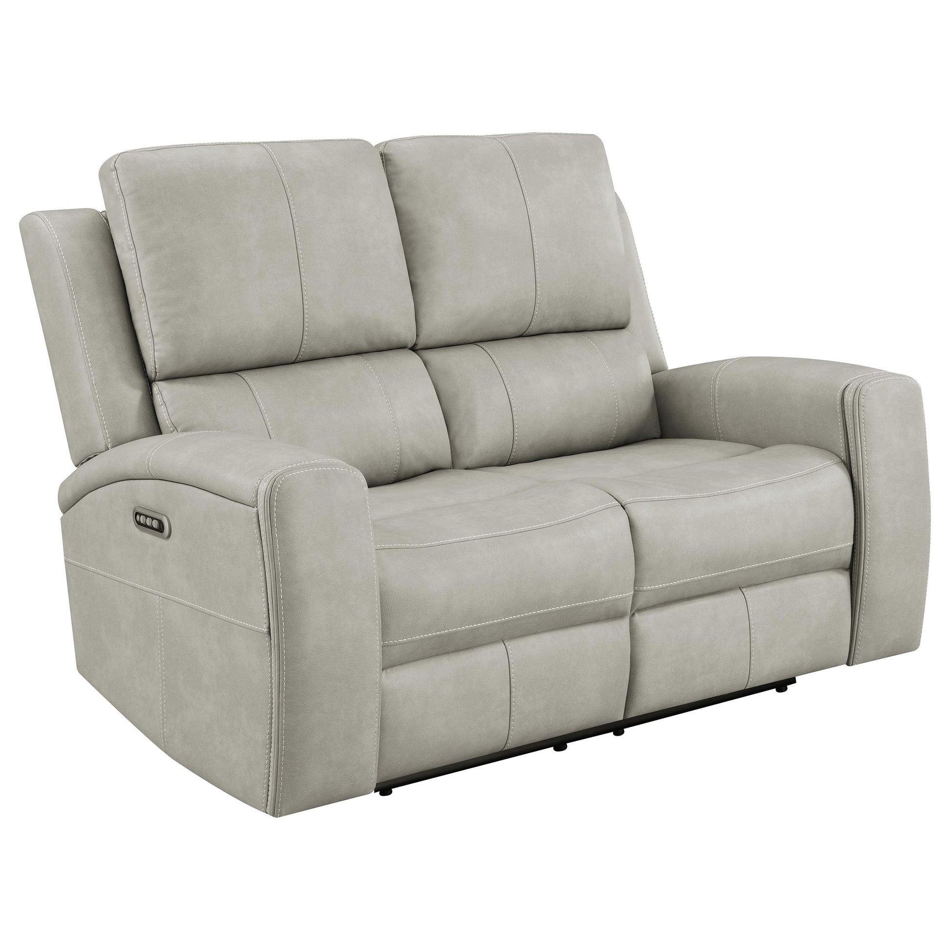 • Grey leatherette upholstery with contrast stitching adds modern texture and comfort