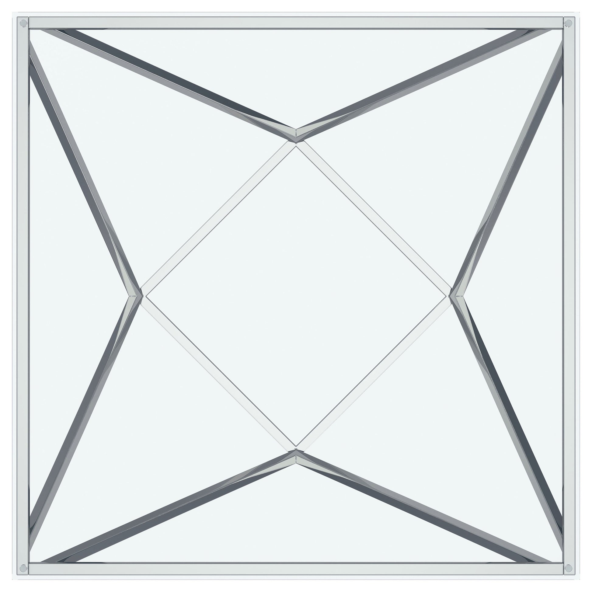 This modern end table showcases a bold geometric base in a polished nickel finish, paired with a durable clear tempered glass top. The tempered glass surface offers scratch resistance and effortless upkeep, while the nickel-finished steel frame ensures lasting stability. Its open framework design brings a contemporary, lightweight aesthetic, ideal for minimalist or industrial-inspired interiors. This versatile accent table blends functionality with style, making it a perfect fit for modern living spaces.