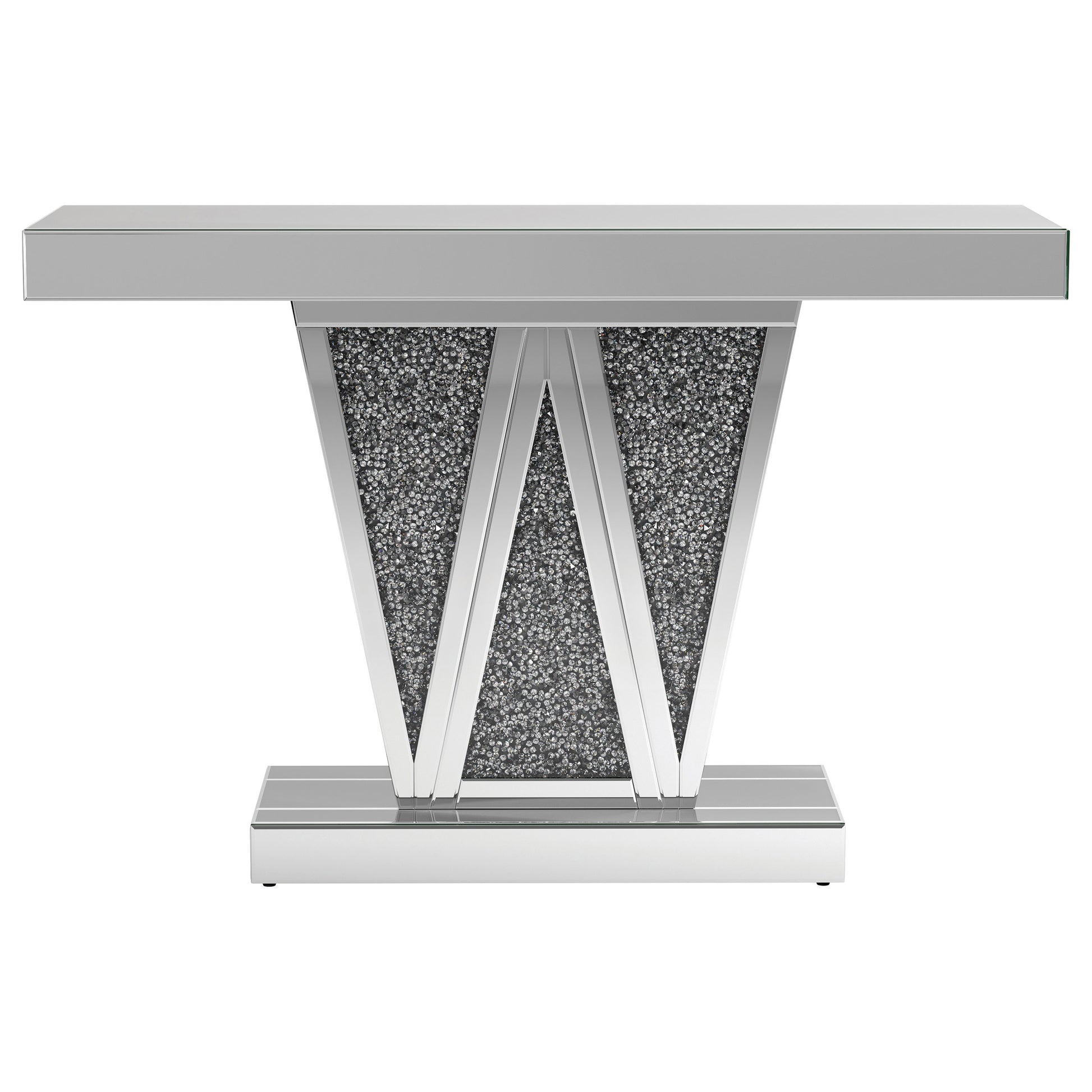 Make a bold statement with this contemporary glam console table, designed to impress with its striking silhouette and luxe materials. The silver mirrored finish is paired with a geometric W-shaped base, inlaid with shimmering faux crystal accents for a dazzling touch. A wide mirrored top completes the look, offering space to showcase décor or serve as an eye-catching entryway focal point.