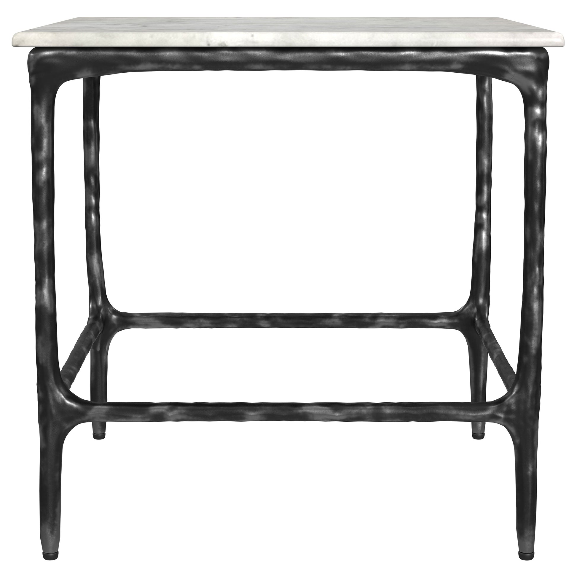 Bringing artisan appeal to the living room, this end table highlights a genuine marble surface that rests on a handcrafted iron frame with an antique black finish. Serve as a side table near a sofa or utilize as an accent table for showcasing décor. Its smooth top and timeless construction adapt effortlessly, making it a versatile occasional table that functions beautifully as a utility table, elevating any seating area.