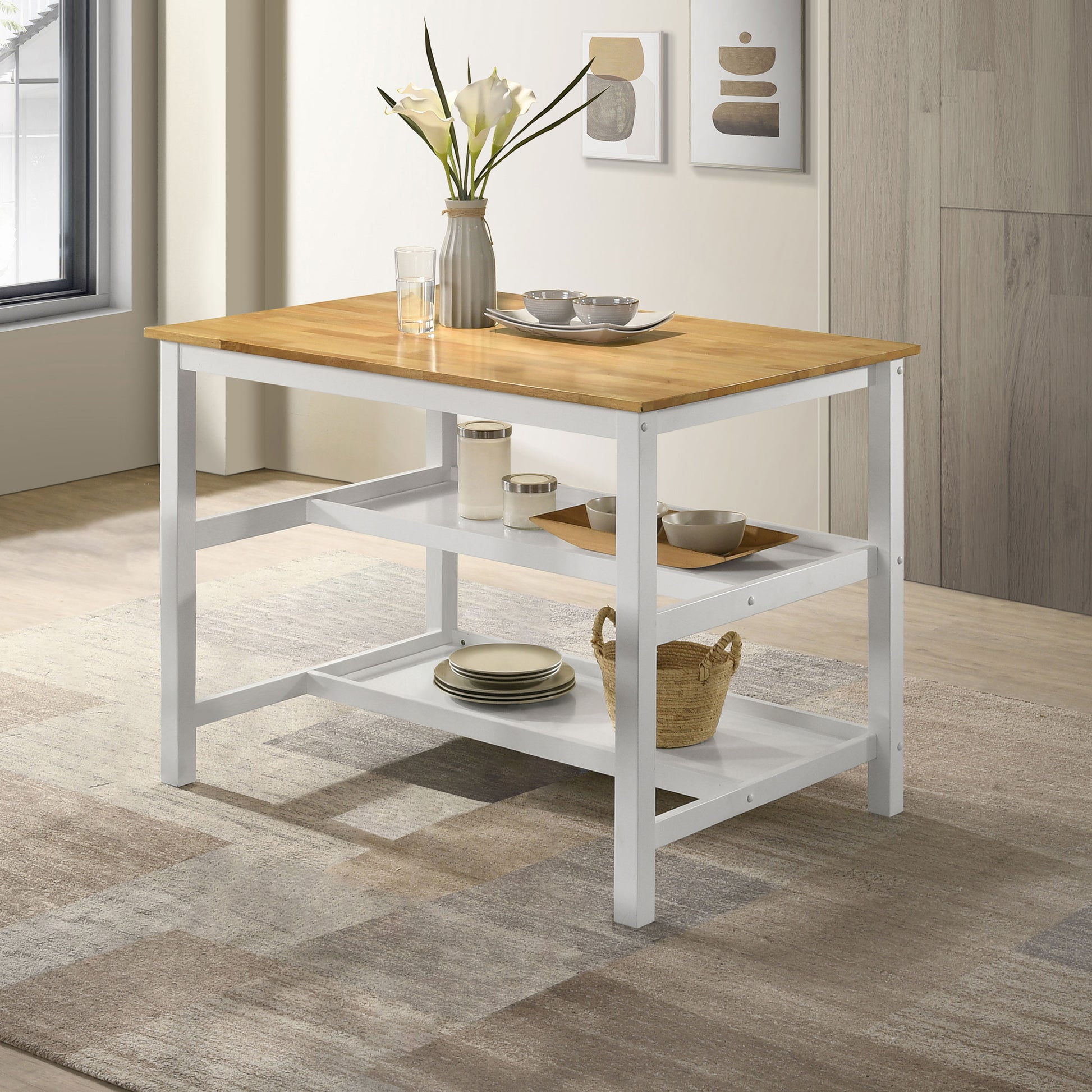 Add easy prep space in your kitchen with this modern farmhouse kitchen island. It features a warm brown wood finish tabletop with plenty of variation for an inviting look and feel. The base of the table features a metal frame with a white finish that's crisp and clean. Two shelves are built into the bottom of the table, offering a perfect spot for prep and serve ware like bowls, vases, and more. Add stools (not included) to create seating.