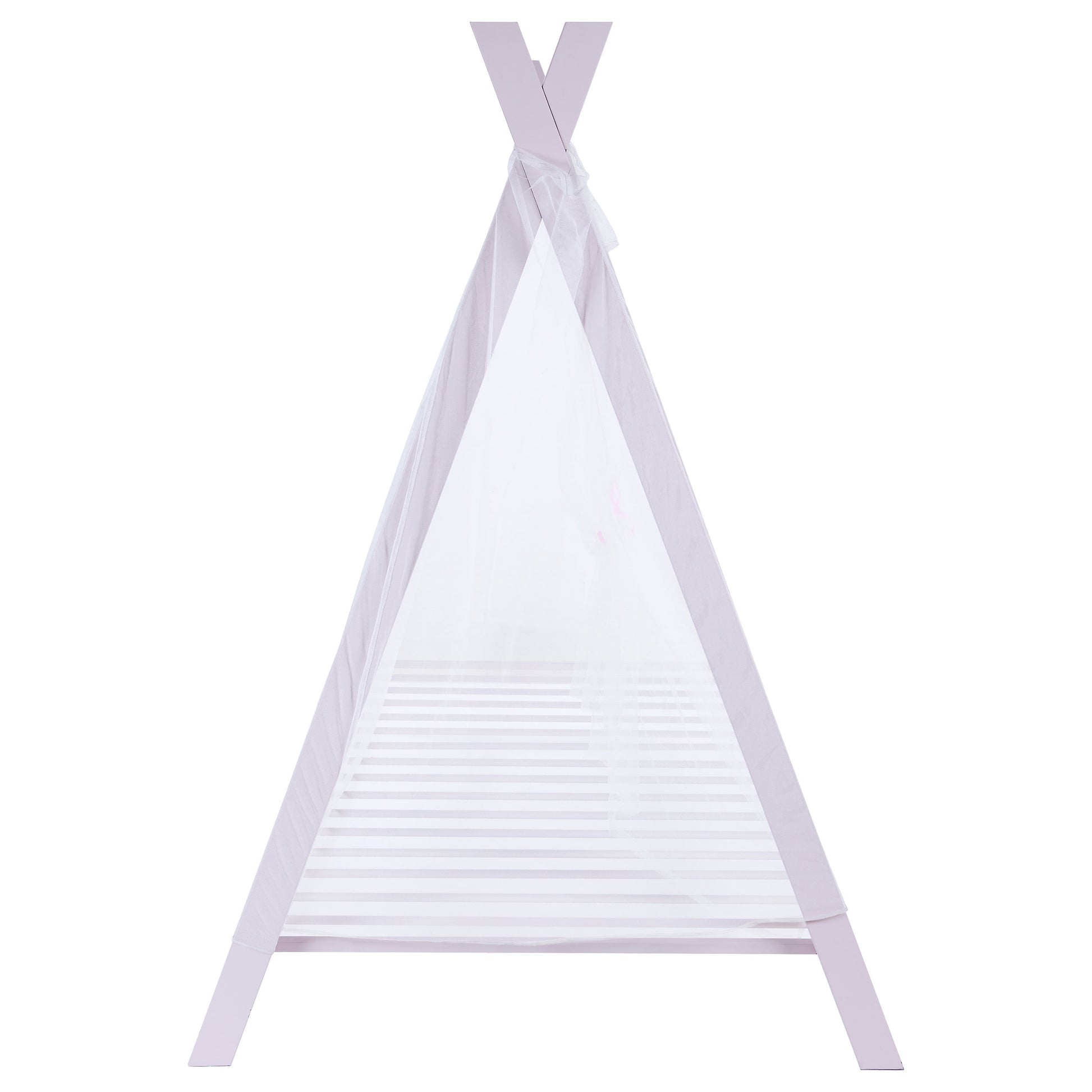 This twin-size tent bed brings a playful touch to any bedroom while offering practical comfort. Crafted from heavy-gauge metal with a powder-coated pink finish, the frame features a charming tent-style design. The included sheer fabric canopy drapes over the structure, creating a cozy retreat. Its platform base supports a mattress without the need for a box spring, ensuring a low-profile look while maintaining sturdy support.