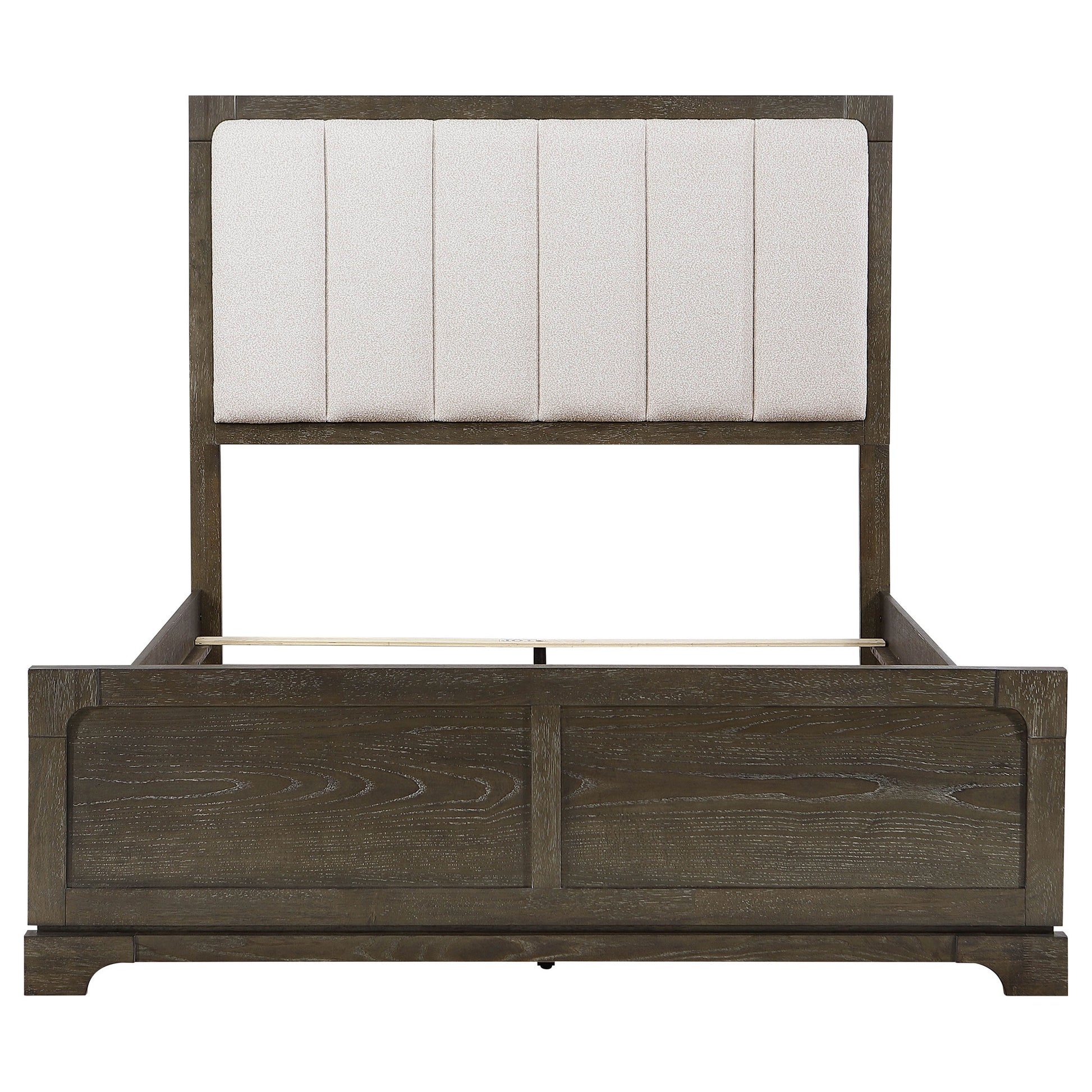 • Queen panel bed with a 59-inch tall upholstered headboard