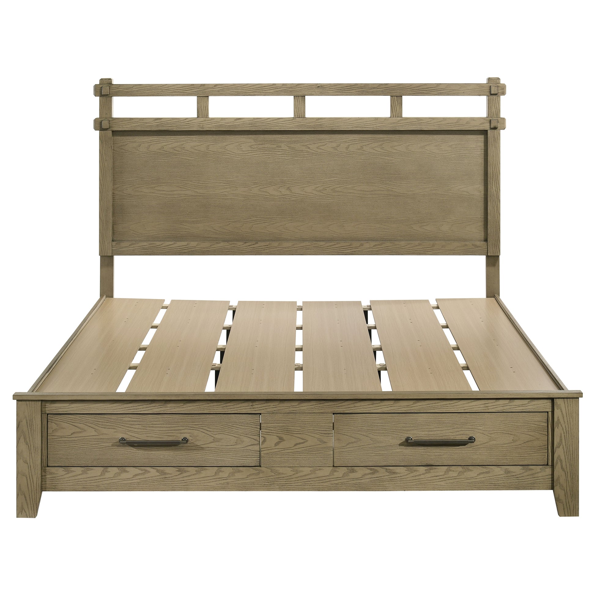 • Eastern king platform storage bed finished in vineyard oak with oak grain embossed veneer