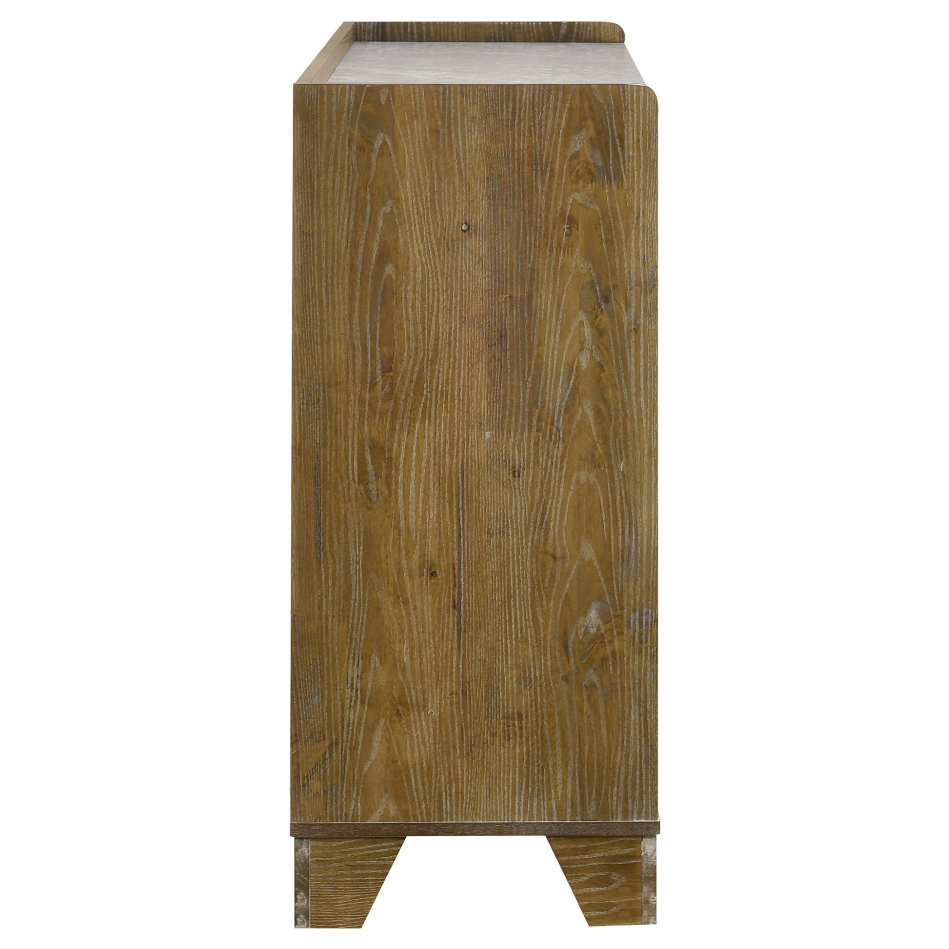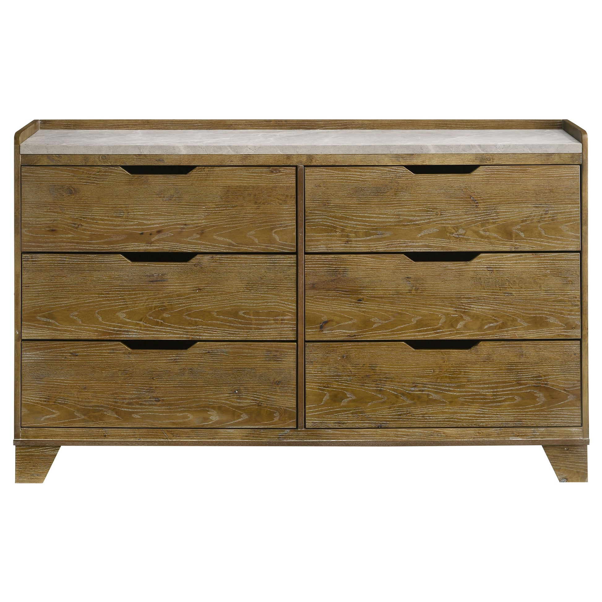 Blending natural warmth with clean-lined simplicity, this six-drawer dresser captures the best of rustic and contemporary design. Crafted from solid rubberwood and finished in a weathered medium oak, it features embossed wood grain surfaces that add character and depth. A faux marble melamine top introduces subtle contrast, while sculpted finger pulls and metal extension drawer glides offer seamless daily use.