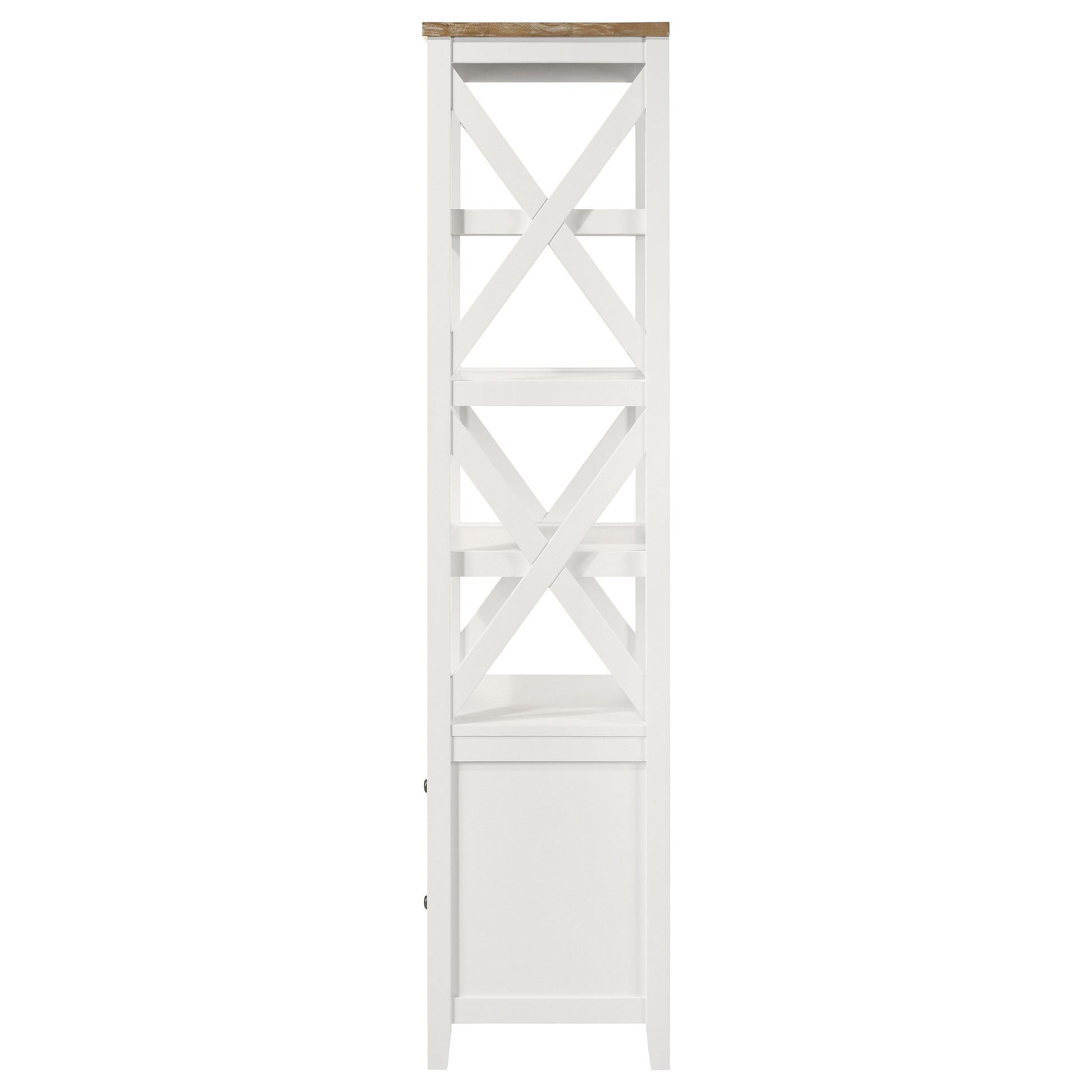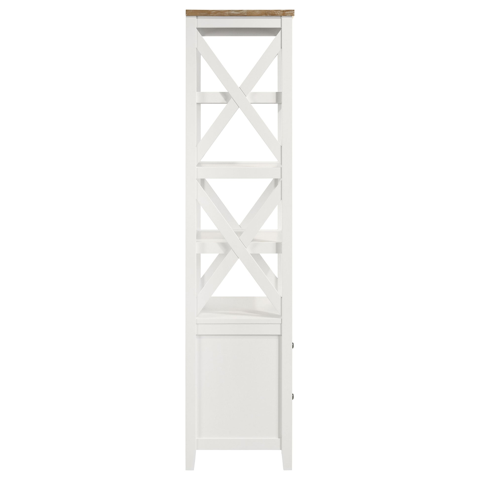 Spacious or compact, a casual living space has storage needs, and this wood media tower is a solid choice. Organize books and implements neatly while adding a fresh, inspiring look to a living room or family room. This modern tower is a mix of cottage-style, coastal, and rustic farmhouse, offering a superbly versatile fit. White finish wood construction features a four-shelf open bookcase above a two-drawer storage unit with full-drawer extension glides, as an eye-catching geometric look places X-shape elements on each side of its open bookcase. A brown finished ash veneer top changes up the style to add even more design flexibility.
