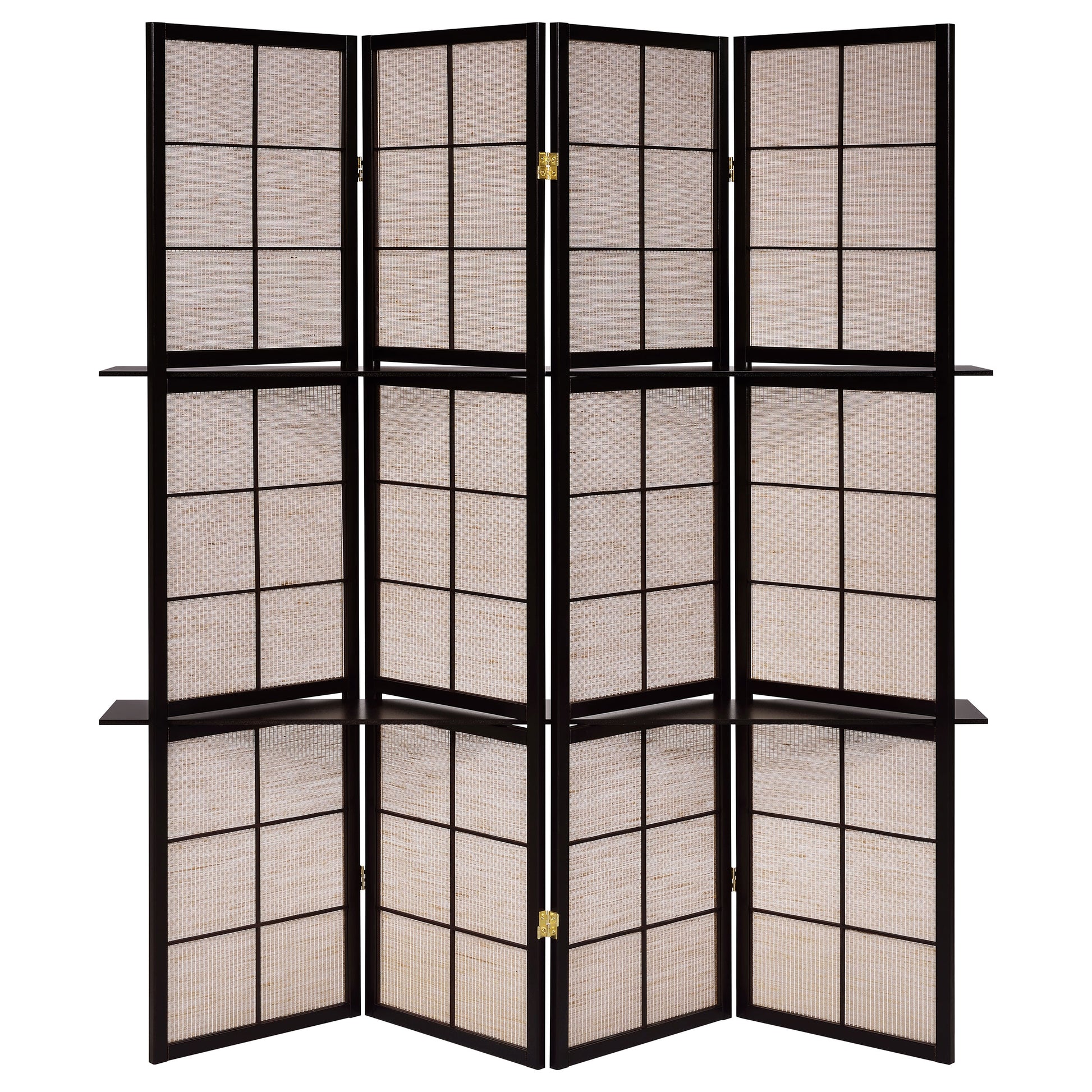 A hint of nature's earth ambiance makes its way into a decor classic. Ideal for a large space, this four-panel screen adds a functional bonus as well as a delightful artistic plus. Four panels join with hinges to accommodate varying configurations. They offer space for storage with diminutive shelving. A deep cappuccino finish embellishes the natural ambiance of tan screen panels.