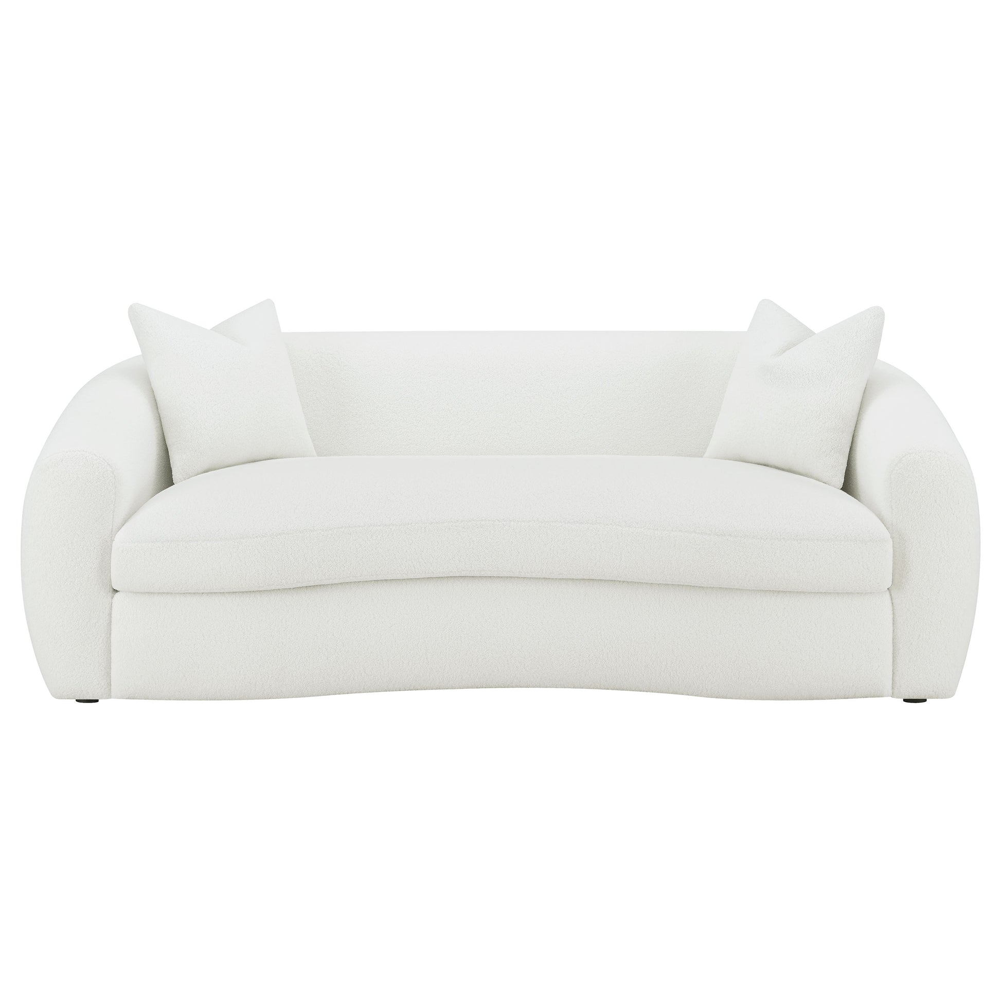Create your modern entertaining area with this contemporary natural seating set, designed with a boucle fabric across its cloud-like contoured frames, sloped armrests and curved bench seats. Coordinating boucle accent pillows with premium faux down fill offer the finishing touch and extra comfort as contrast bold black legs hidden below elevate each seat ever so slightly.