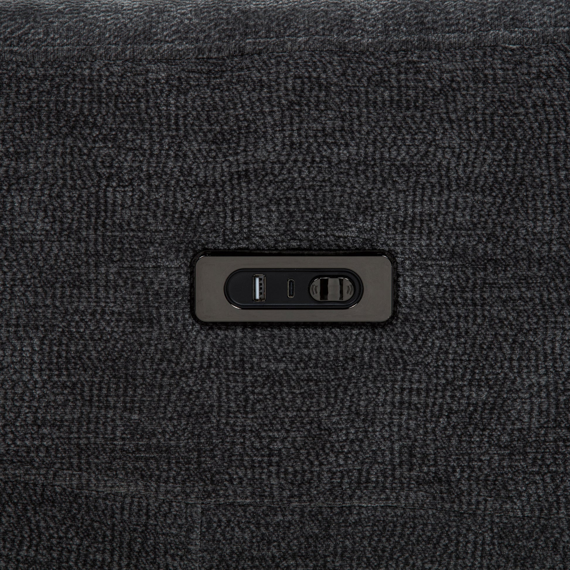 • Dark grey chenille upholstery features a soft texture with a refined woven appearance