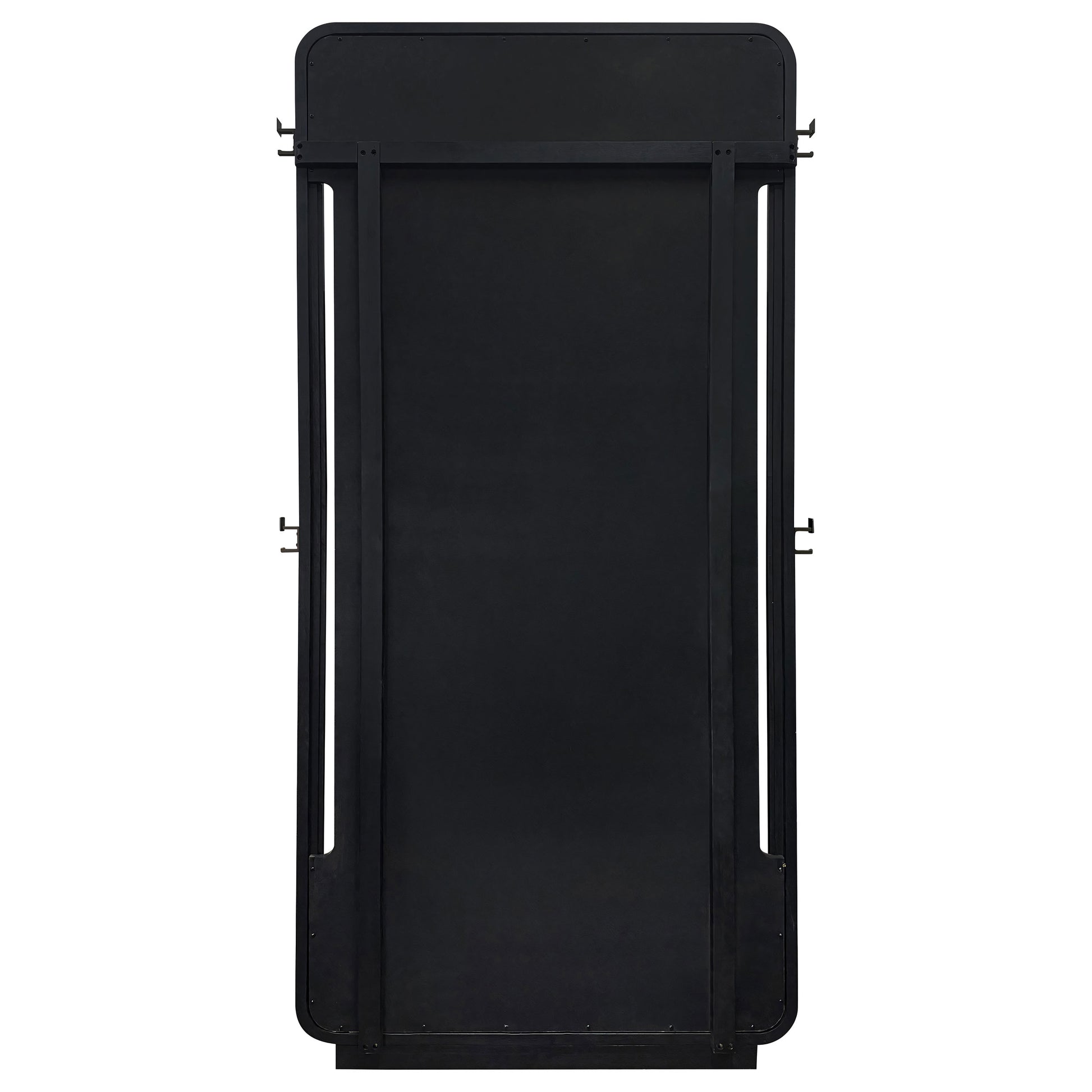 Bold in scale and softly contoured, this full-length floor mirror brings sculptural presence to any room. Framed in a deep burnished black finish with rounded corners, it offers a tall, uninterrupted reflection perfect for everyday use. Designed to lean securely against the wall, it also features integrated side hooks ideal for hanging garments, accessories, or daily essentials with subtle utility and style.