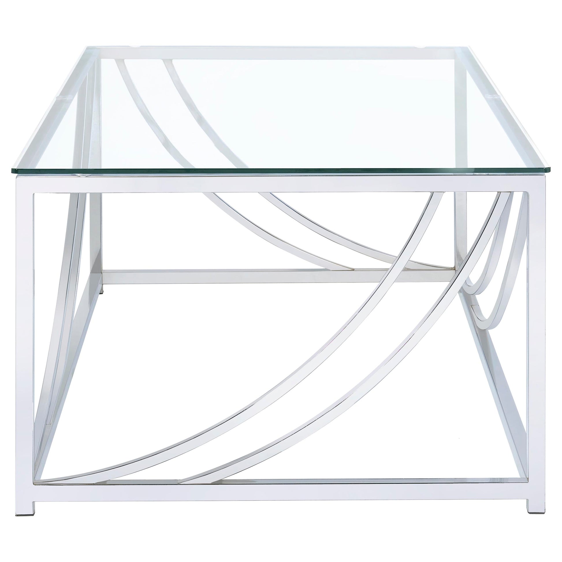 This coffee table set, including a cocktail table and end table, blends sleek modern design with practical functionality. Both pieces feature clear tempered glass tops and electroplated polished chrome frames. The curved metal accents add a contemporary, elegant touch to the design. Built with sturdy metal construction, this set is durable and stylish, making it a perfect addition to any living room or seating area.