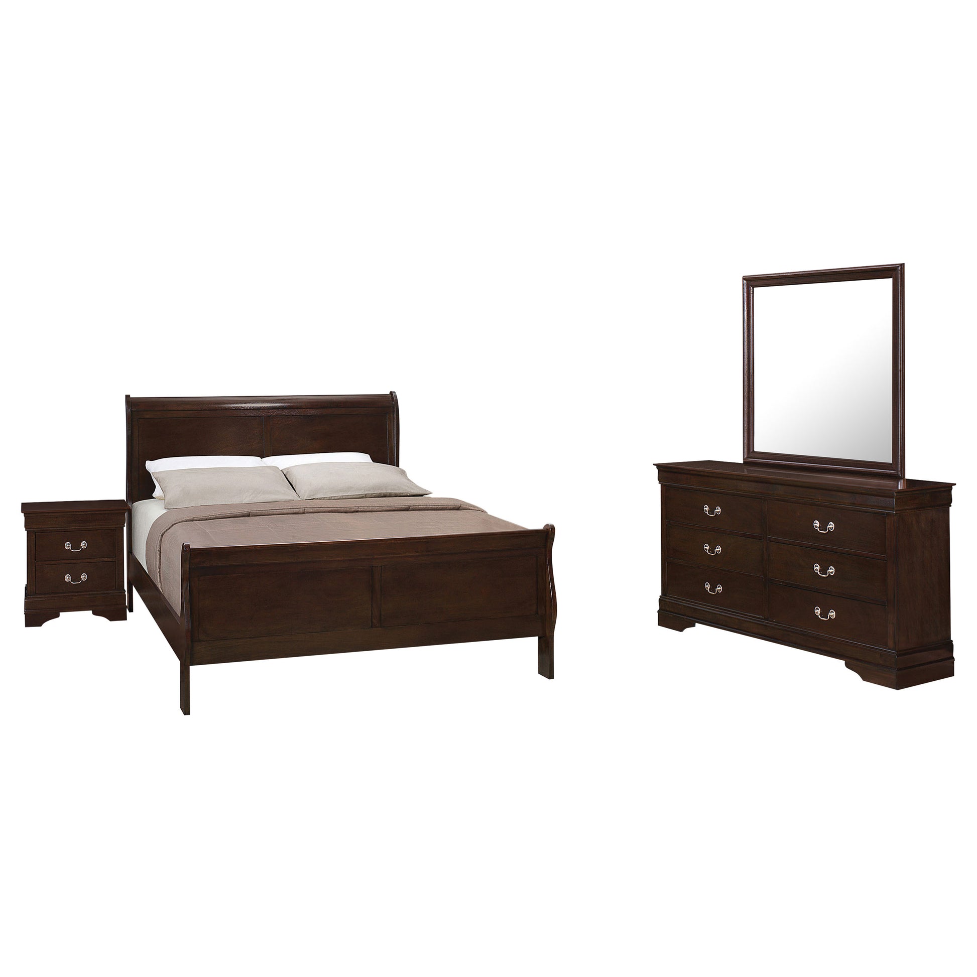 The Louis Philippe collection is highlighted by this 4-piece bedroom set that is perfect for the guest bedroom or youth bedroom. The Full bed (also available in Eastern King, Queen, and Twin) is characterized by a high headboard and low footboard, both with slightly flared styling. The nightstand and dresser have deep drawers with dovetail construction and silver bail handles for convenient pull-out and stylish appeal. Place the impressive rectangular mirror fits upon the dresser to complete the look. Built from select hardwoods and wood veneer, this traditional-style set comes with a cappuccino finish that adds a warm ambiance to the bedroom.