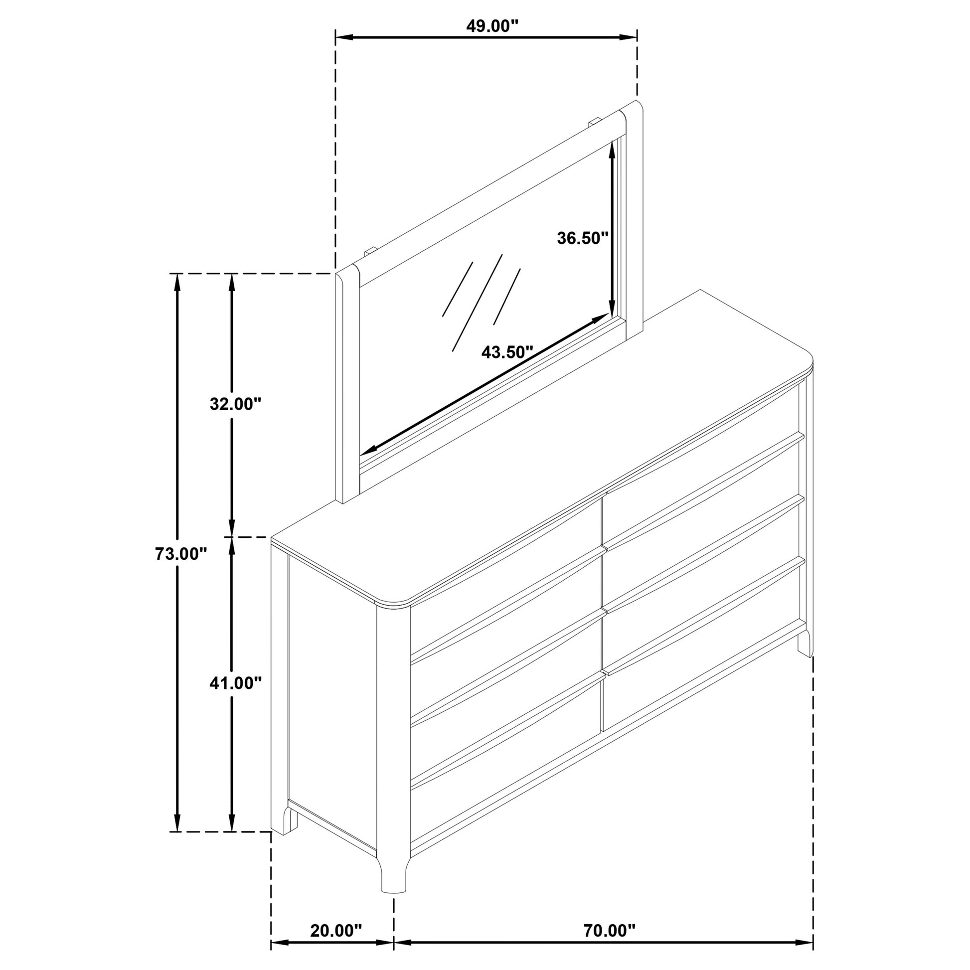 • Dresser and mirror frame feature rounded corners and glass is beveled for depth
