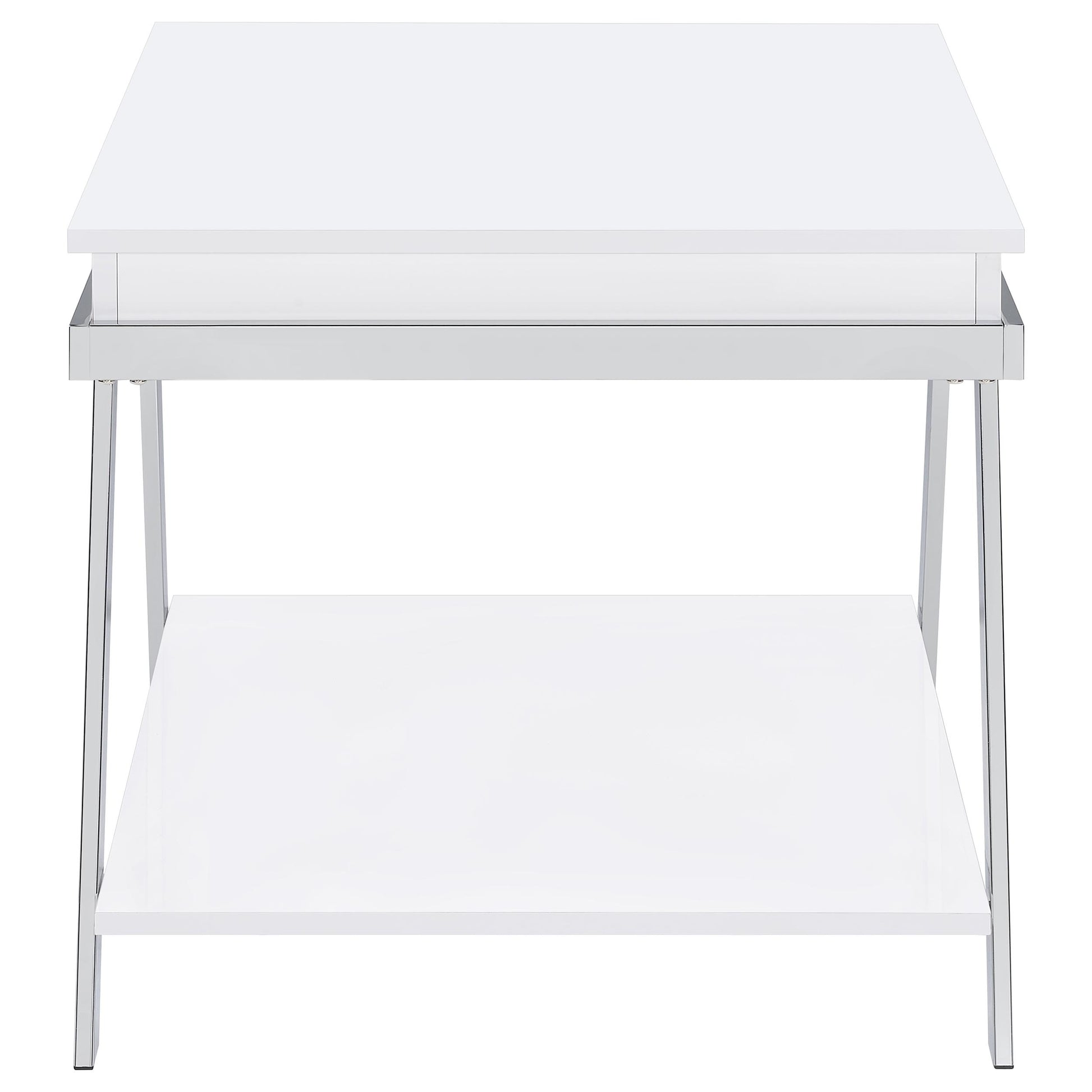 Complete your living room with this modern coffee table and end table set. Pieces feature a white high-gloss finish and angled chrome legs, delivering a clean, cohesive aesthetic. The coffee table includes a lift-top for hidden storage and a lower shelf, while the end table offers a convenient storage shelf. Built with engineered wood and durable metal, this stylish set blends contemporary design with functional appeal for trendy, practical spaces.
