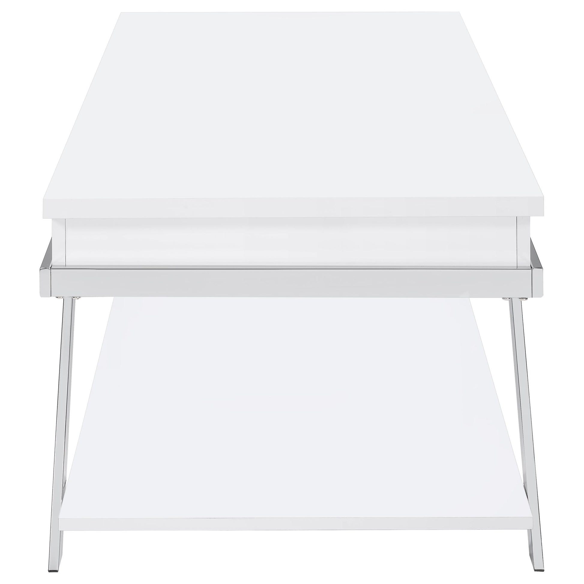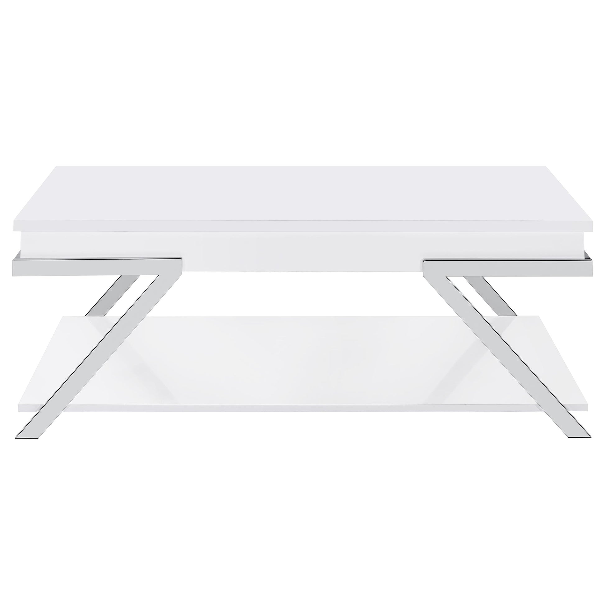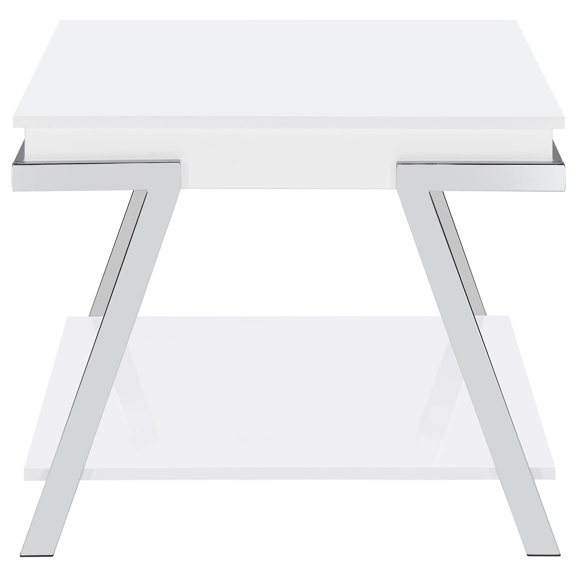 Complete your living room with this modern coffee table and end table set. Pieces feature a white high-gloss finish and angled chrome legs, delivering a clean, cohesive aesthetic. The coffee table includes a lift-top for hidden storage and a lower shelf, while the end table offers a convenient storage shelf. Built with engineered wood and durable metal, this stylish set blends contemporary design with functional appeal for trendy, practical spaces.