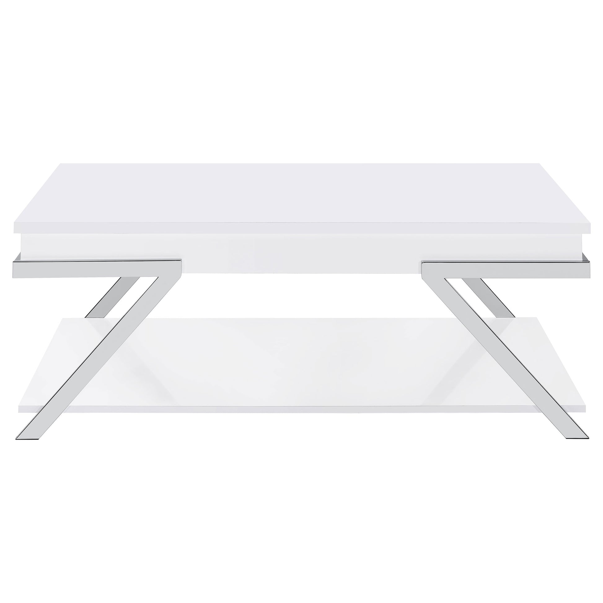 Capture the stylish, inspired look of effortless design suited to modern spaces. This ultra-contemporary lift-top coffee table made of white high gloss finish MDF with paper coating creates a stir in your laid-back living room or family room. Angular metal framing adds a fresh aesthetic boost. A modular-like configuration works well in today’s trending spaces as this table features a lift-top mechanism to reveal extra hidden storage and allow its top to inch closer to you. Seek a seamless contemporary attitude with this stylish coffee table.
