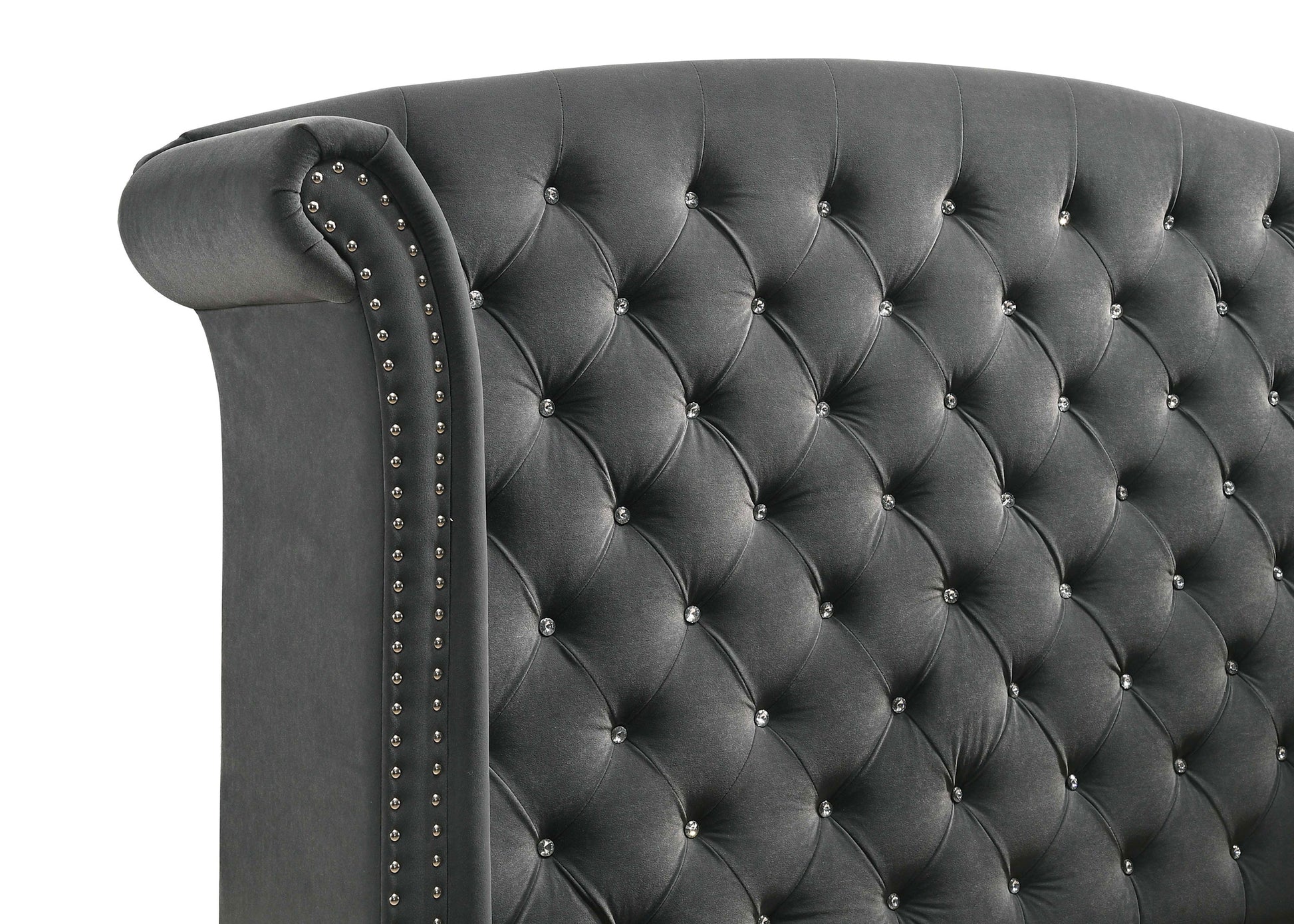 • Wingback headboard features button tufting, nailhead trim, and plush shape