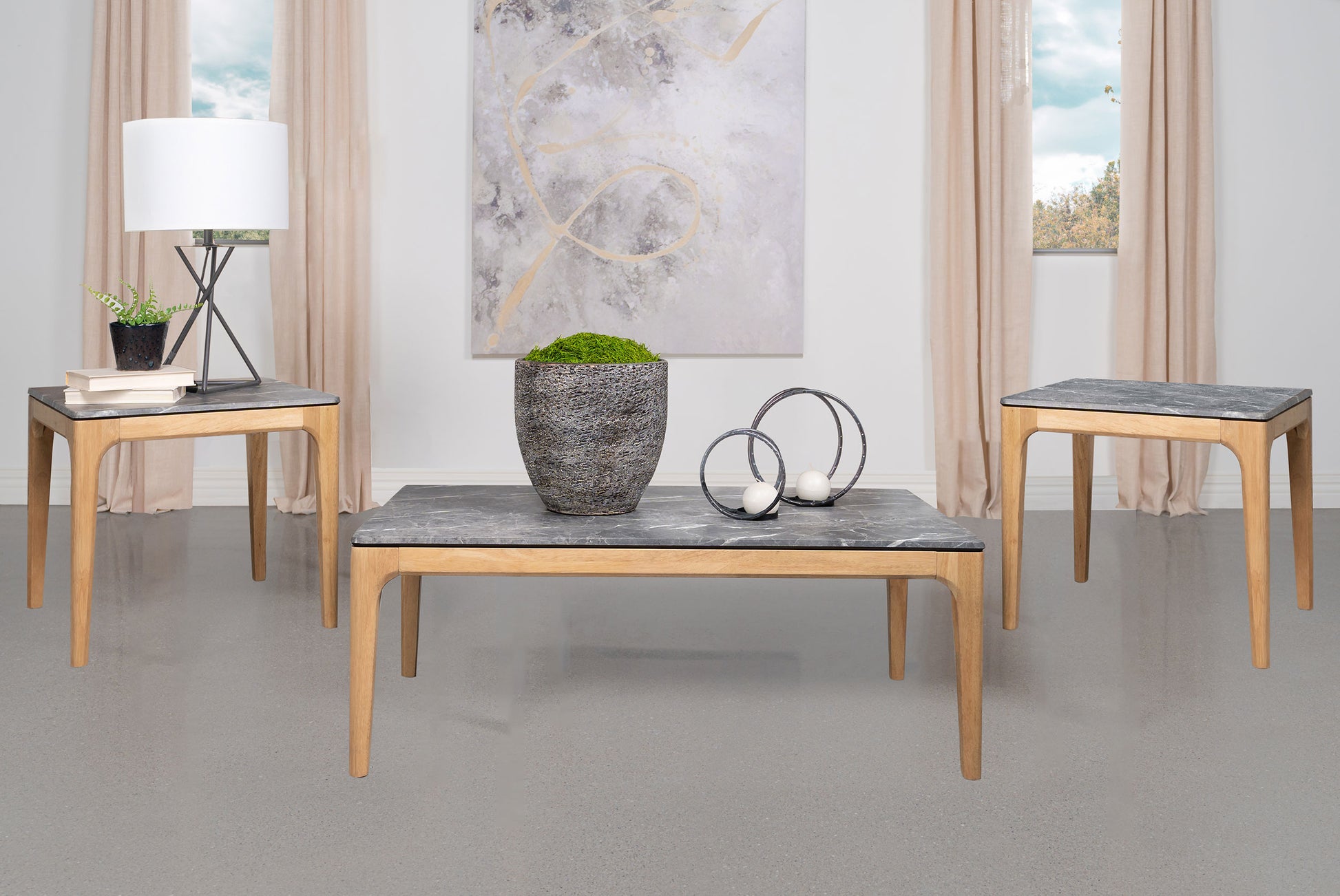 • Coffee table set with high-pressure laminate tops in grey faux marble finish for elegant style