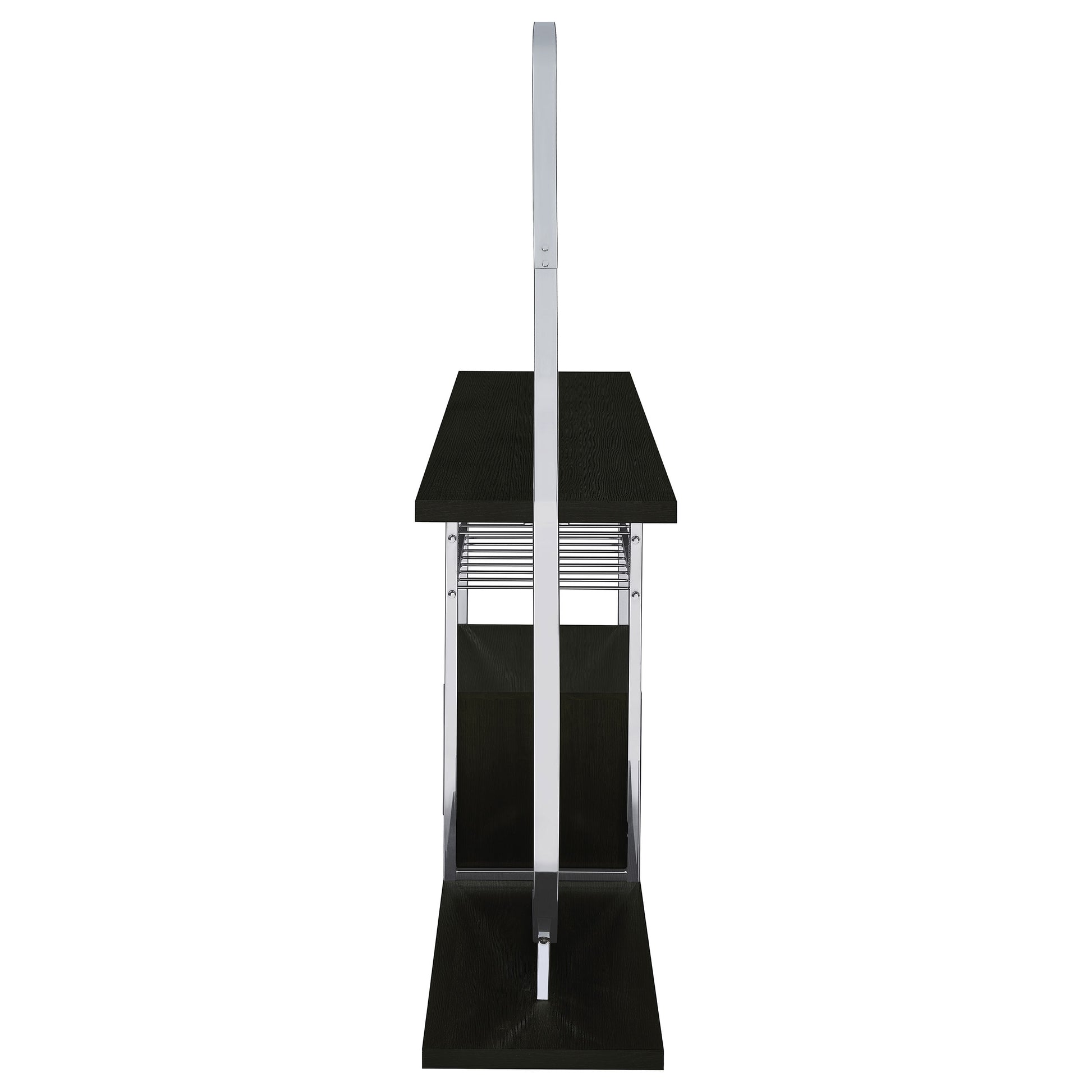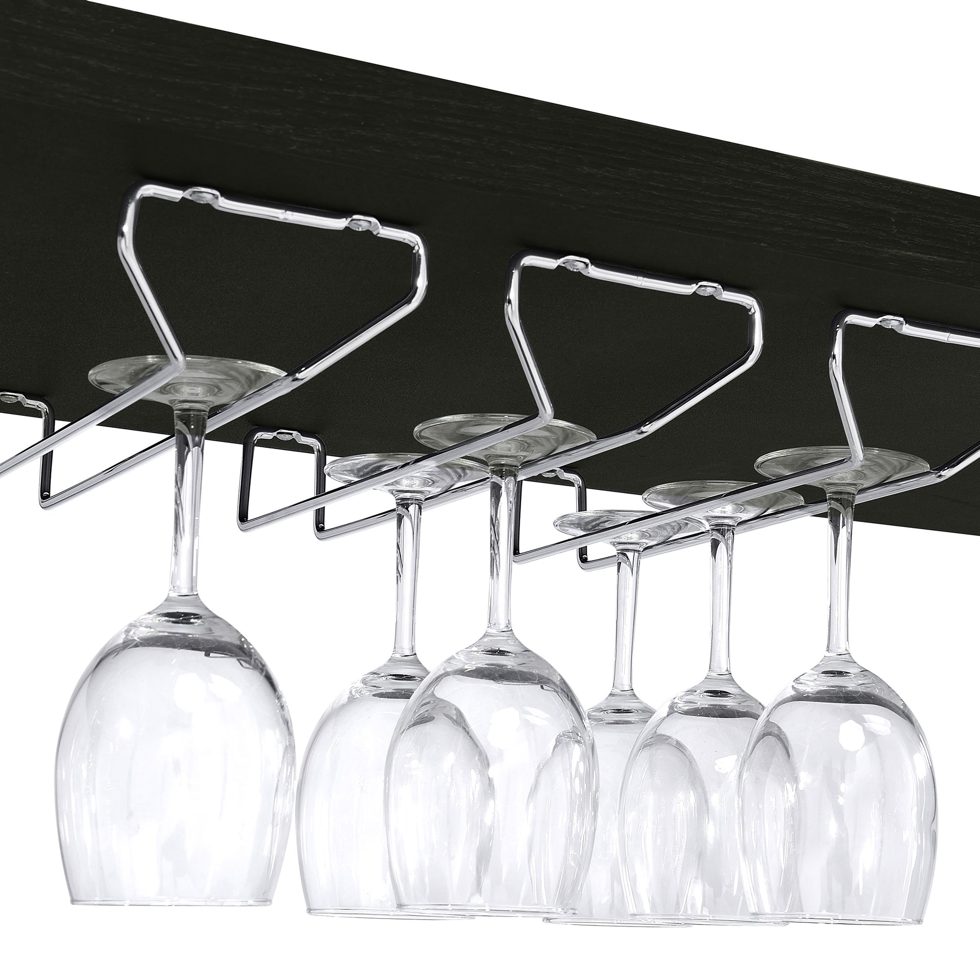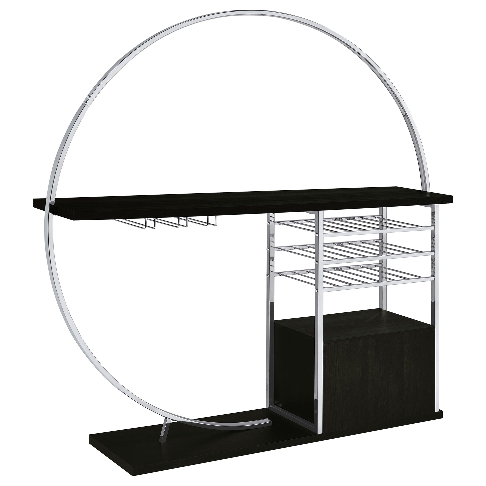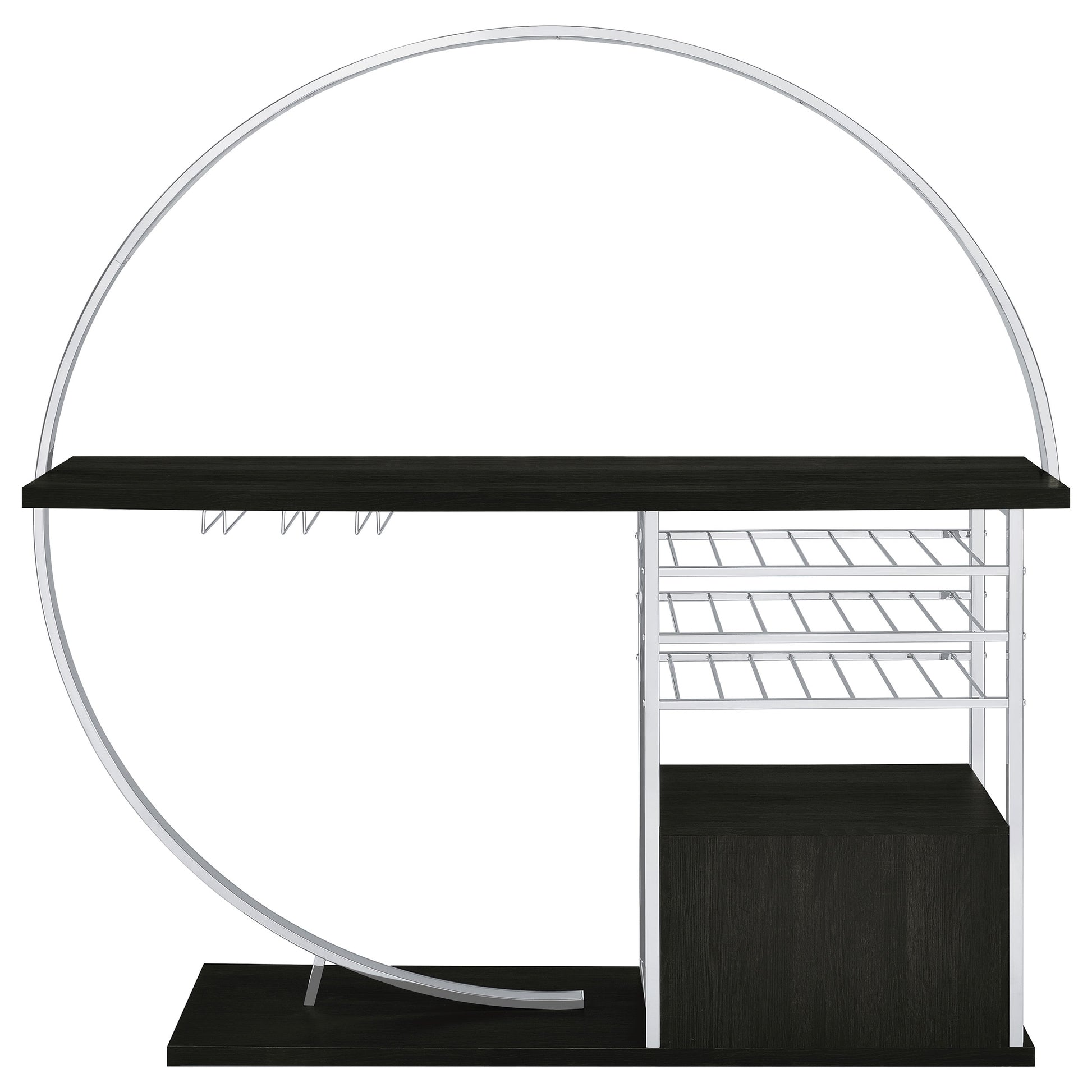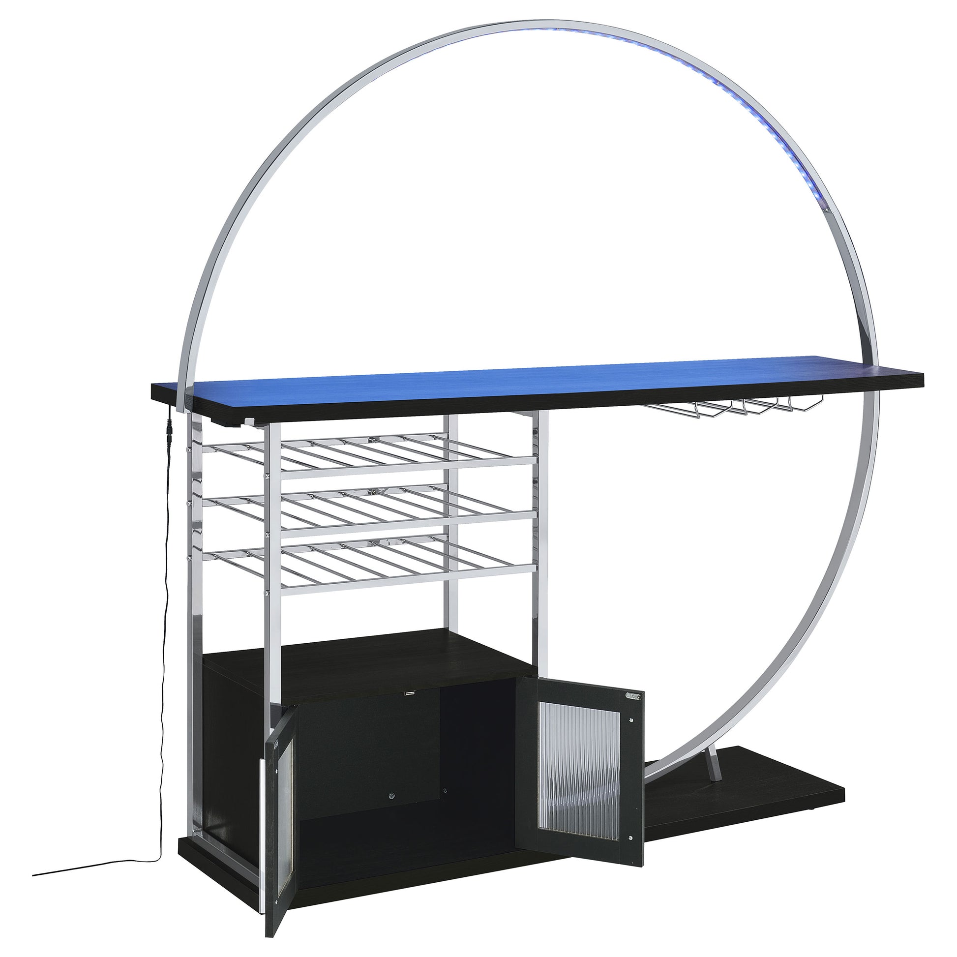 Transform your space into a beacon of style with this contemporary wine cabinet that marries function with cutting-edge design. Bathed in the glow of LED lighting with a choice of eight vibrant colors, this piece becomes the centerpiece of any entertainer's haven. The sleek chrome electroplated metal frame supports a durable composite wood tabletop, perfect for hosting an array of glasses and spirits. Below, a two-door cabinet conceals essentials, while three tiers cradle up to 21 bottles of your finest wine. With a built-in stemware rack, this bar doesn't just store your collection, it showcases it, making every occasion a toast-worthy affair.