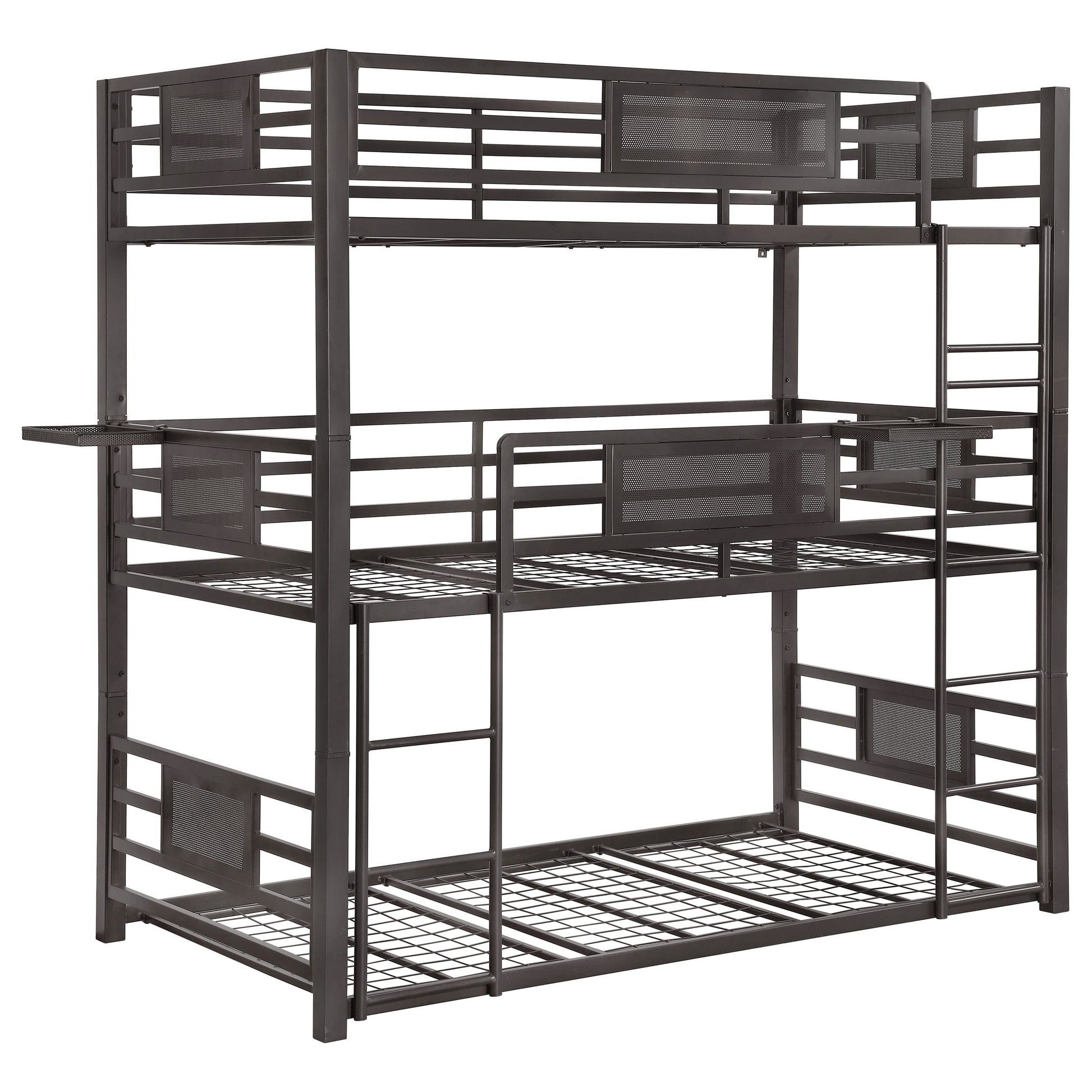 Create a cohesive, contemporary feel in any room with this triple bunk bed. With the ability to separate into three beds, or any combination in-between, this base lies flat on the floor. Built-in ladders help to elongate the streamlined silhouette, with classy and matching guard rails. A dark bronze finish sleekens the smooth lines and adds structure to any modern space. These bunks are sleek and clean, perfect for a modern motif.