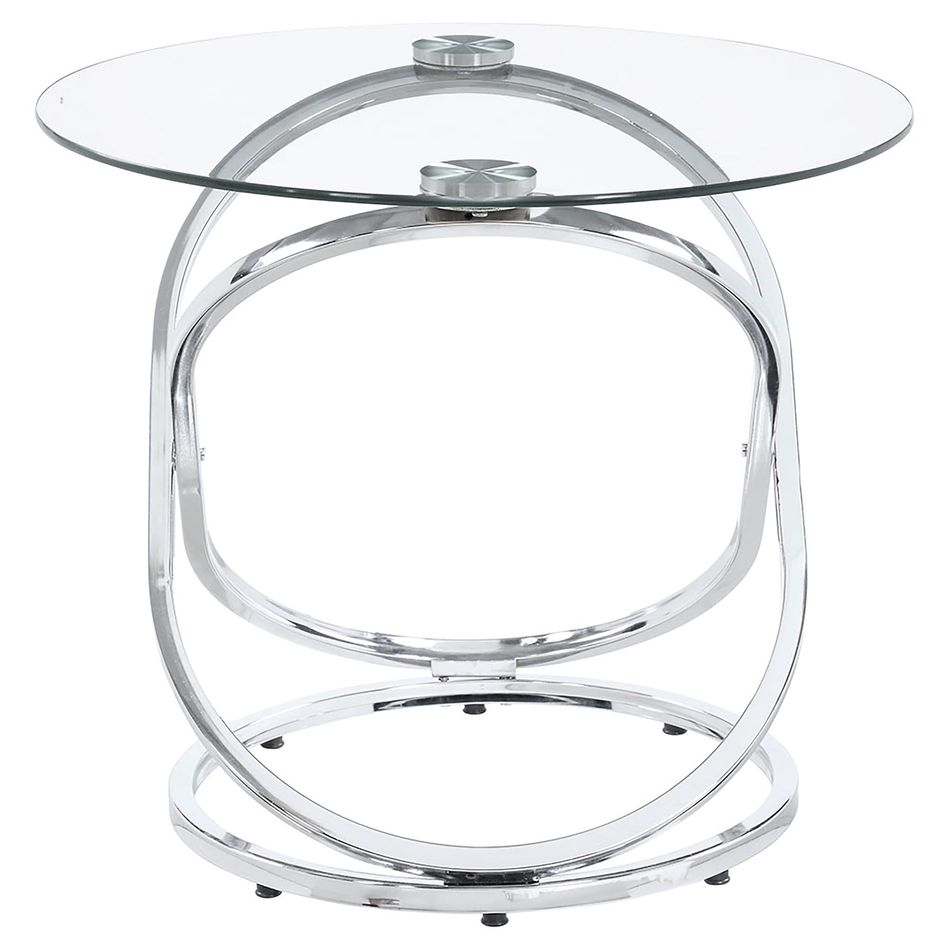 This striking coffee table set includes a cocktail table and two matching side tables, perfect for modern living spaces. Featuring clear tempered glass tops, these tables exude elegance and durability. The bases showcase polished chrome-finished metal in an intertwined ring design, adding a touch of contemporary flair. The open framework enhances visual lightness, making the set ideal for smaller spaces. Designed for style and functionality, this set is a versatile addition to any room.