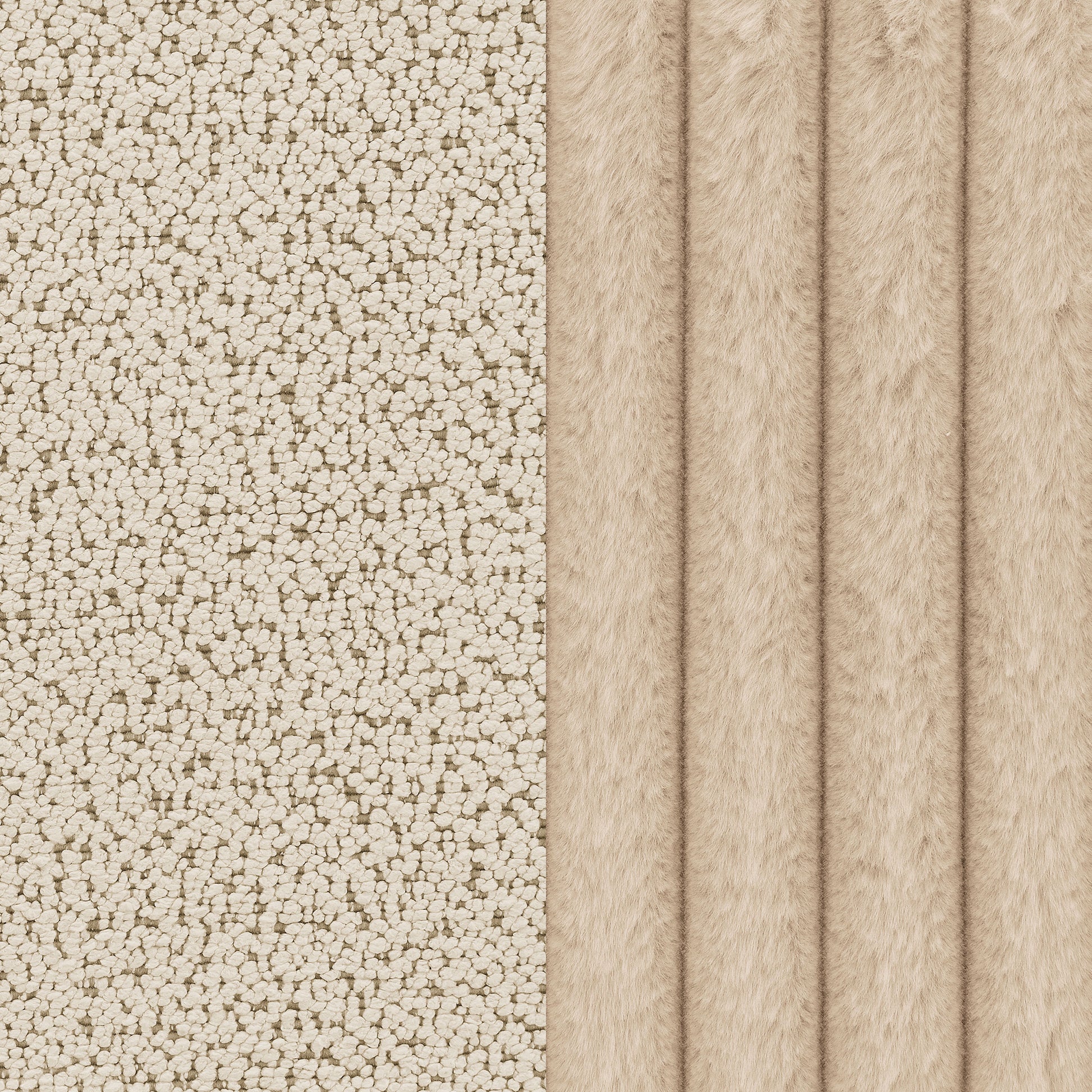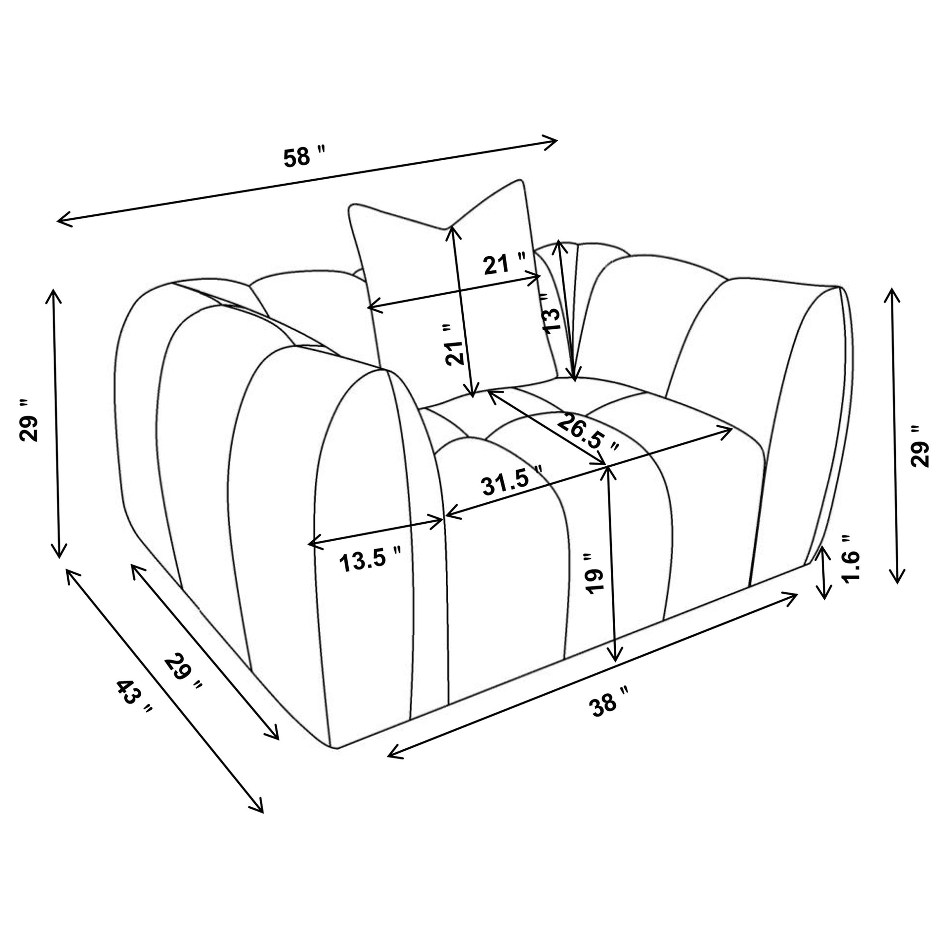 Introduce impeccable comfort and cozy vibes in your living room or den with a modern chair-and-a-half. This piece not only offers an extra-wide silhouette for the perfect curl-up spot but also features a fun bubble-like design that serves as the perfect interior focal point. The chair's wrap-around extra plush channeling with tufted accents on a waterfall bench seat adds an inviting warmth to your décor. It's further enhanced by wide corduroy accent pillows filled with premium down-like fill for lasting comfort. Upholstered in sand pebble boucle, this armchair offers a fresh, modern silhouette with piped armrests and channel tufting on the arms and back, creating a rich, inviting look that adds depth to your decor.